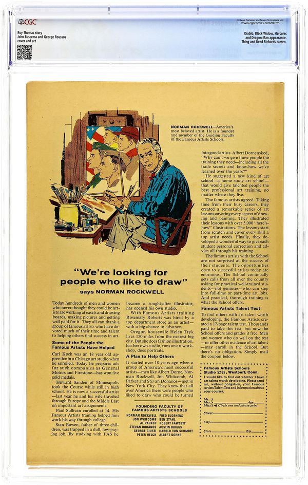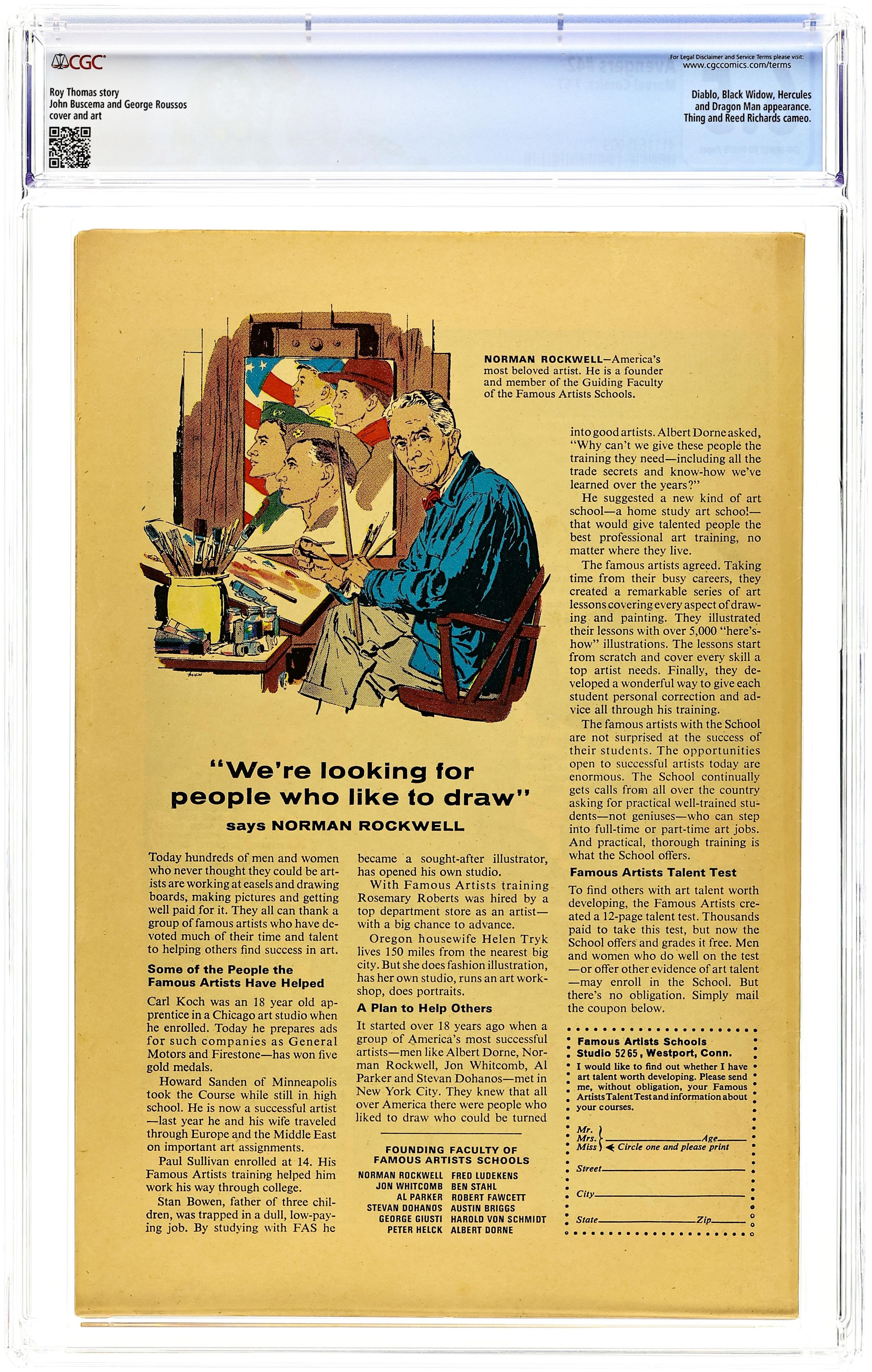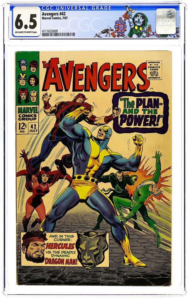 "The Plan and the Power!" Part 2 of 2. Script by Roy Thomas. Pencils by John Buscema. Inks by George Roussos (as George Bell). Cover by John Buscema and George Roussos. The Avengers are in disarray after going down to defeat to Diablo and the Dragon Man last issue. The Master of Alchemydeparted for Transylvania after his triumph -- and took Goliath and the Wasp with him. So after they regroup; Pietro, Wanda, and Hawkeye depart for Europe, and this time the Lion of Olympus joins them! Once the Avengers' aero-car lands, Hercules begins fighting Dragon Man, while the other heroes confront Diablo! The Master of Alchemy appears on his way to victory again...until a surprise avenger joins the fight! Thank goodness for the red, white, and blue! In the meantime, behind the Bamboo Curtain, the Black Widow tries to escape from her communist captors! Cameo appearances by Mr. Fantastic and the Thing. Avengers Lineup: Captain America, Goliath, Hawkeye, Hercules, Quicksilver, Scarlet Witch, and the Wasp. (Note: This story was reprinted in Marvel Triple Action #34.) 36 pages. Cover price $0.12. Grade: CGC 6.5 explanation of grade Condition: Used (collectible)