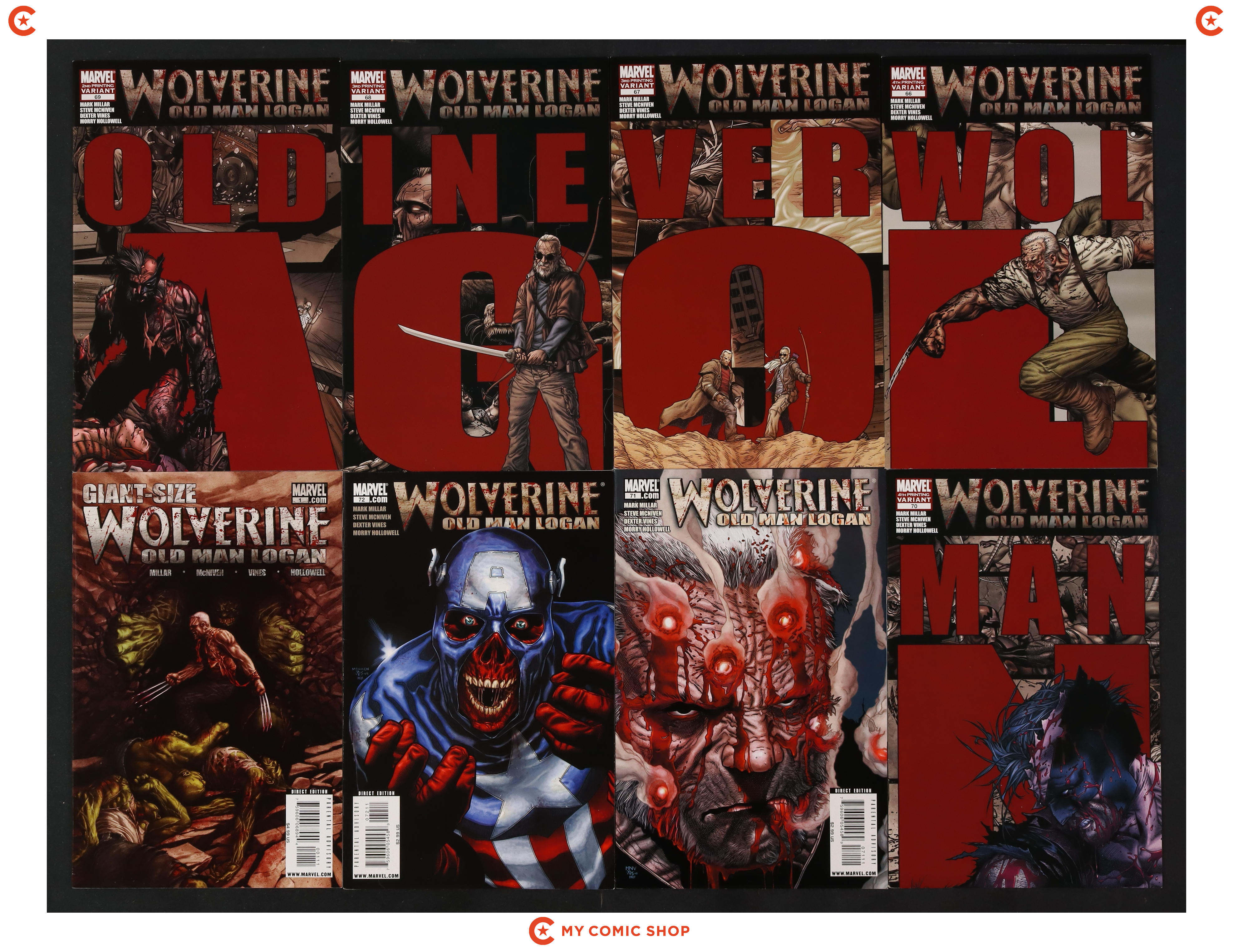 Issues 66REP.4TH, 67REP.3RD, 68REP.3RD, 69REP.2ND, 70REP.4TH, 71A, and 72A of Wolverine (2003 2nd Series); and 1A of Wolverine Giant-Size Old Man Logan (2009). Most will grade in the VF to FN range.