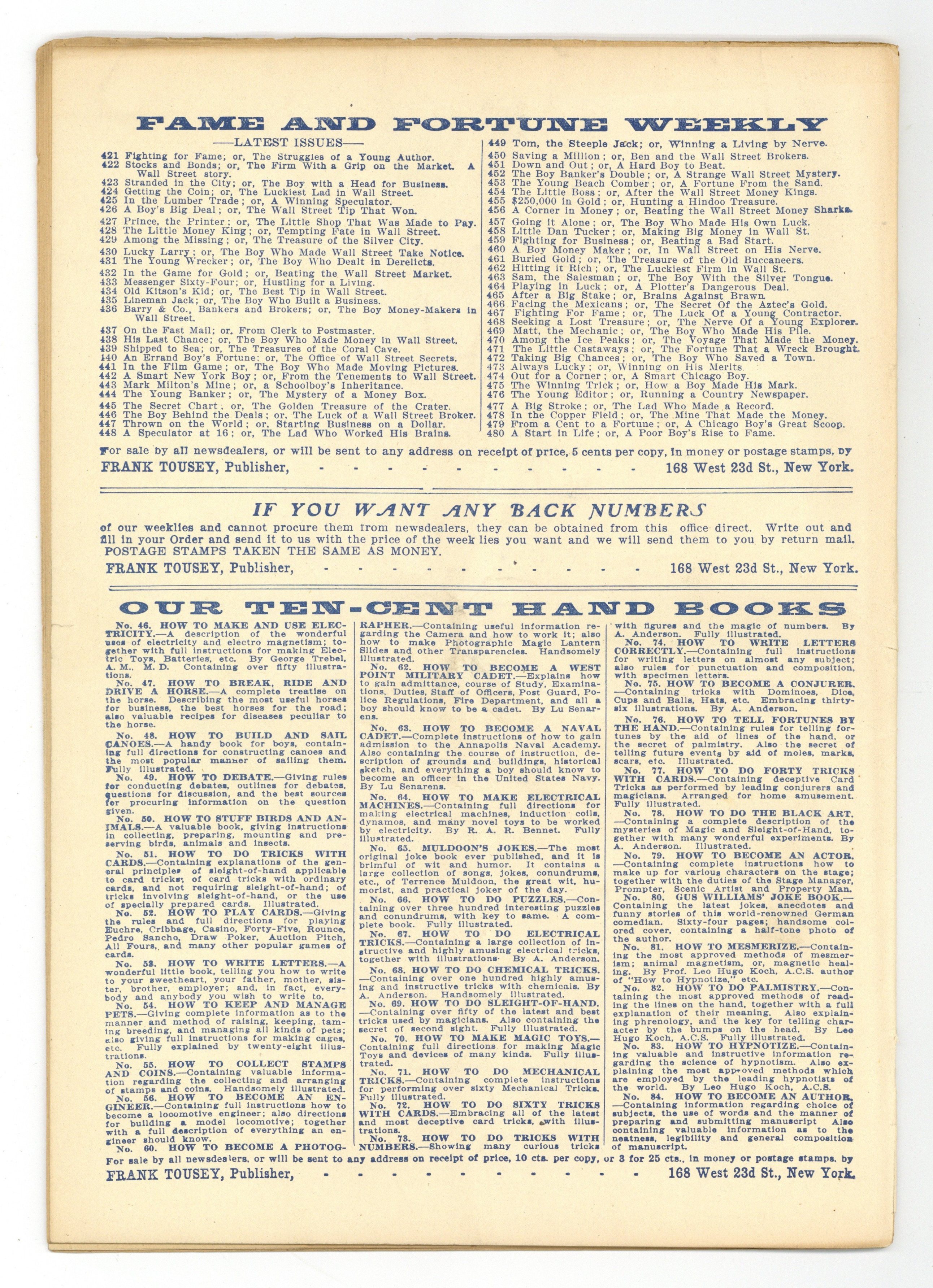 Published Dec 1914 by Frank Tousey.Fame and Fortune Weekly (1905-1928 Frank Tousey) 480 GD/VG 3.0