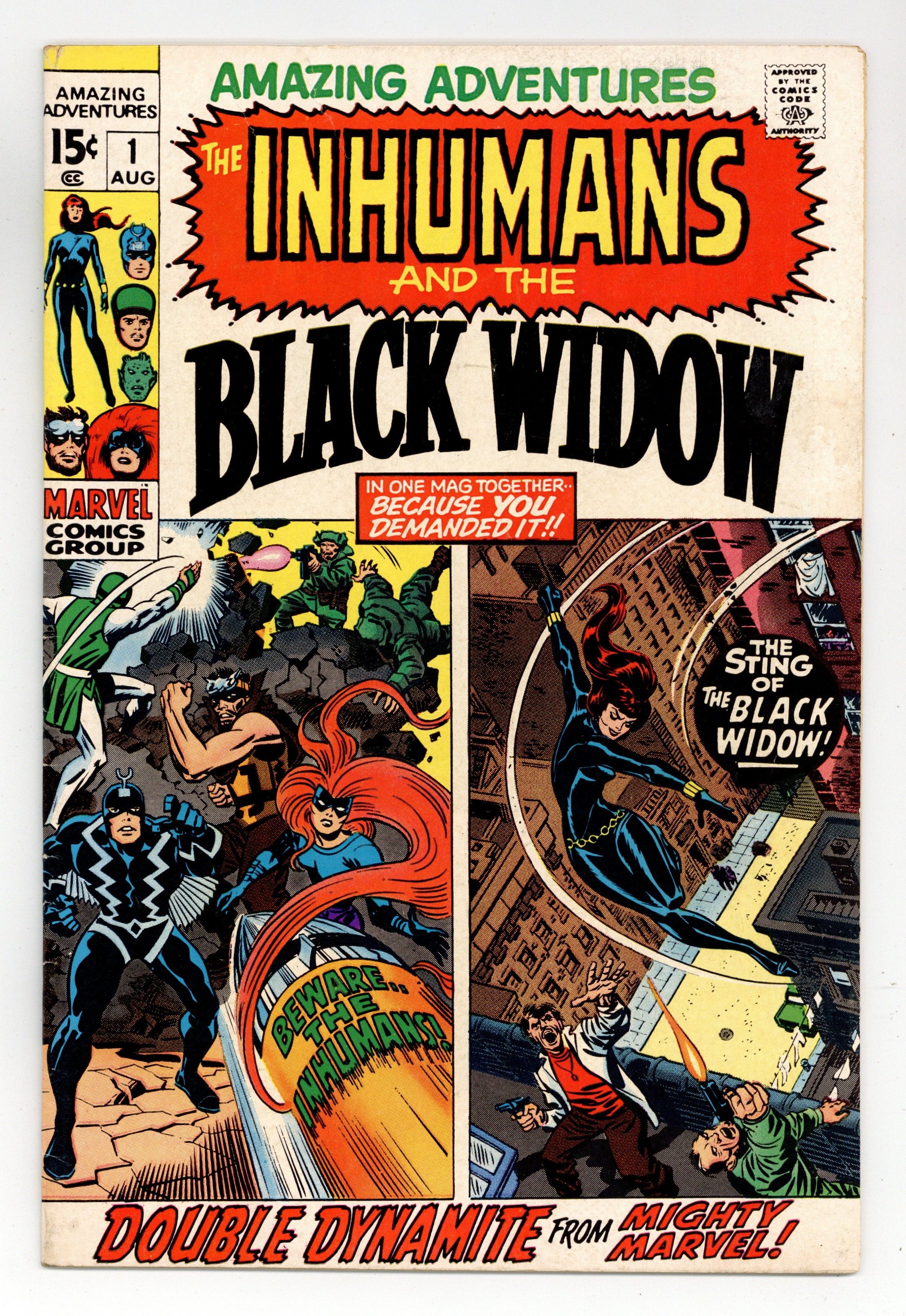 Cover pencils by Jack Kirby (Inhumans) and John Romita (Black Widow), inks by John Romita. "Beware... the Inhumans!", script by Jack Kirby, pencils by Jack Kirby, inks by Chic Stone; Two missiles are shot at the Inhumans; The second one is destroyed just before it hits and the wreckage points to the Fantastic Four as the ones firing it. "Then Came... the Black Widow," script by Gary Friedrich, pencils by John Buscema, inks by John Verpoorten; Black Widow, bored by her civilian life, gets a new costume. 36 pgs, full color. $0.15. Cover price $0.15. Grade: VG 4.0 explanation of grade Condition: Used (collectible)