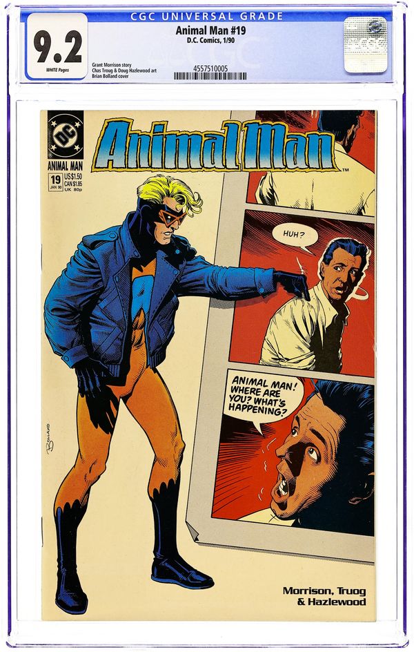 Cover art by Brian Bolland. A New Science of Life, script by Grant Morrison, pencils by Chas Truog, inks by Doug Hazlewood; In his vision, Buddy encounters the original version of Animal Man (from Strange Adventures) who protests his replacement; When Animal Man comes out of his vision, he returns home to his greatest tragedy. Ad for Superboy: The Comic Book, art by Kevin Maguire. Ad for Gotham By Gaslight, art by Mike Mignola. Suggested for Mature Readers. New Format. 36 pgs. $1.50. Cover price $1.50. Grade: CGC 9.2 explanation of grade Condition: Used (collectible)