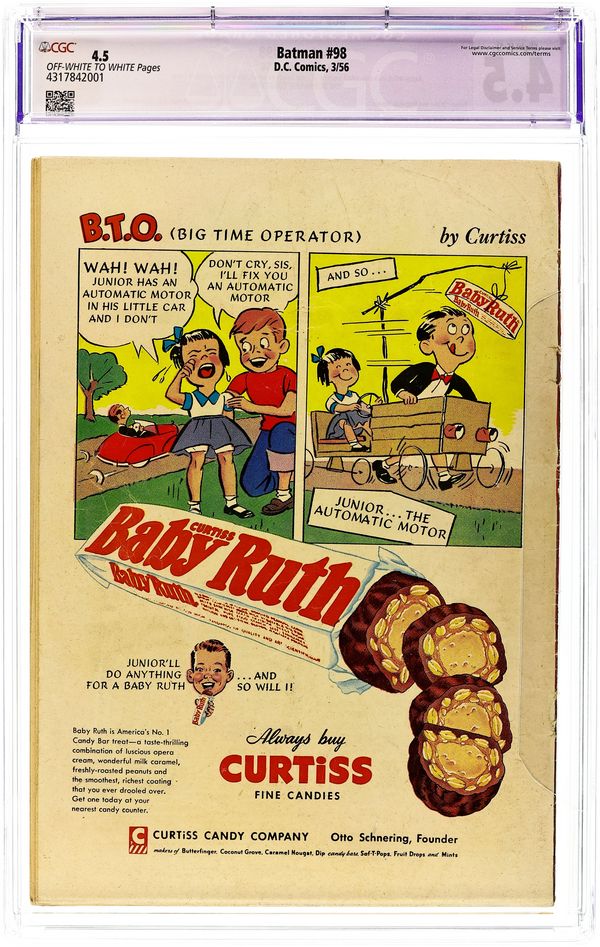 Cover by Win Mortimer. "The Return of Mister Future," script by Arnold Drake (pages 1-7, first Drake story for DC) and Bill Finger (pages 7-8), pencils by Dick Sprang, inks by Charles Paris; Crooks steal a secret weapon created by author Jules Verne, so the Capred Crusaders travel back in time, bring Verne back to the present, and have him design a counter weapon that will nullify his deadly weapon. 2/3-page Casey the Cop story by Henry Boltinoff. Healthy Teeth for You and Your Pet! public service announcement with Buzzy, script by Jack Schiff, art by Win Mortimer. "The Desert Island Batman," script by Edmond Hamilton, pencils by Sheldon Moldoff, inks by Charles Paris; Bruce takes a cruise on a yacht populated by millionaires because he suspects something will happen, and it does when a gang hijacks the ship and holds the millionaires captive on an island. One-page Casey the Cop story by Henry Boltinoff. Patrolman with Six Legs article by Joe Mallory. "Secret of the Batmobile," script by Bill Finger, pencils by Sheldon Moldoff, inks by Charles Paris; Vicki Vale unwittingly discovers the true identity of the Batman without knowing it when she takes a photo of the Batmobile after it's engine was damaged. 36 Pages, Full Color. Cover price $0.10. Grade: CGC 4.5 explanation of grade Condition: Used (collectible)