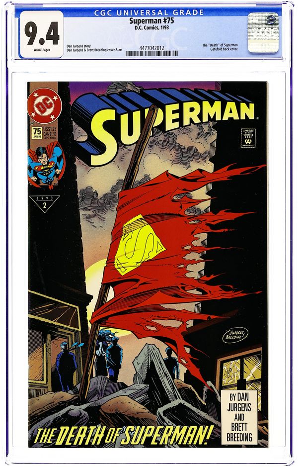 1st printing. Doomsday! Part 7 of 7. "Doomsday!" Story by Dan Jurgens. Art by Dan Jurgens and Brett Breeding. Here it is, the issue that rocked the DC Universe. An unstoppable force named Doomsday crash landed on Earth and has cut a swath of death and destruction across the country, all the way to Metropolis. Even the Justice League, the world's premiere super-team, was powerless before this creature's might. Now one man stands defiantly in Doomsday's way and vows that the creature's insanity stops here. Superman fights his strongest opponent to the death in the streets of Metropolis. Cover price $1.25. Grade: CGC 9.4 explanation of grade Condition: Used (collectible)