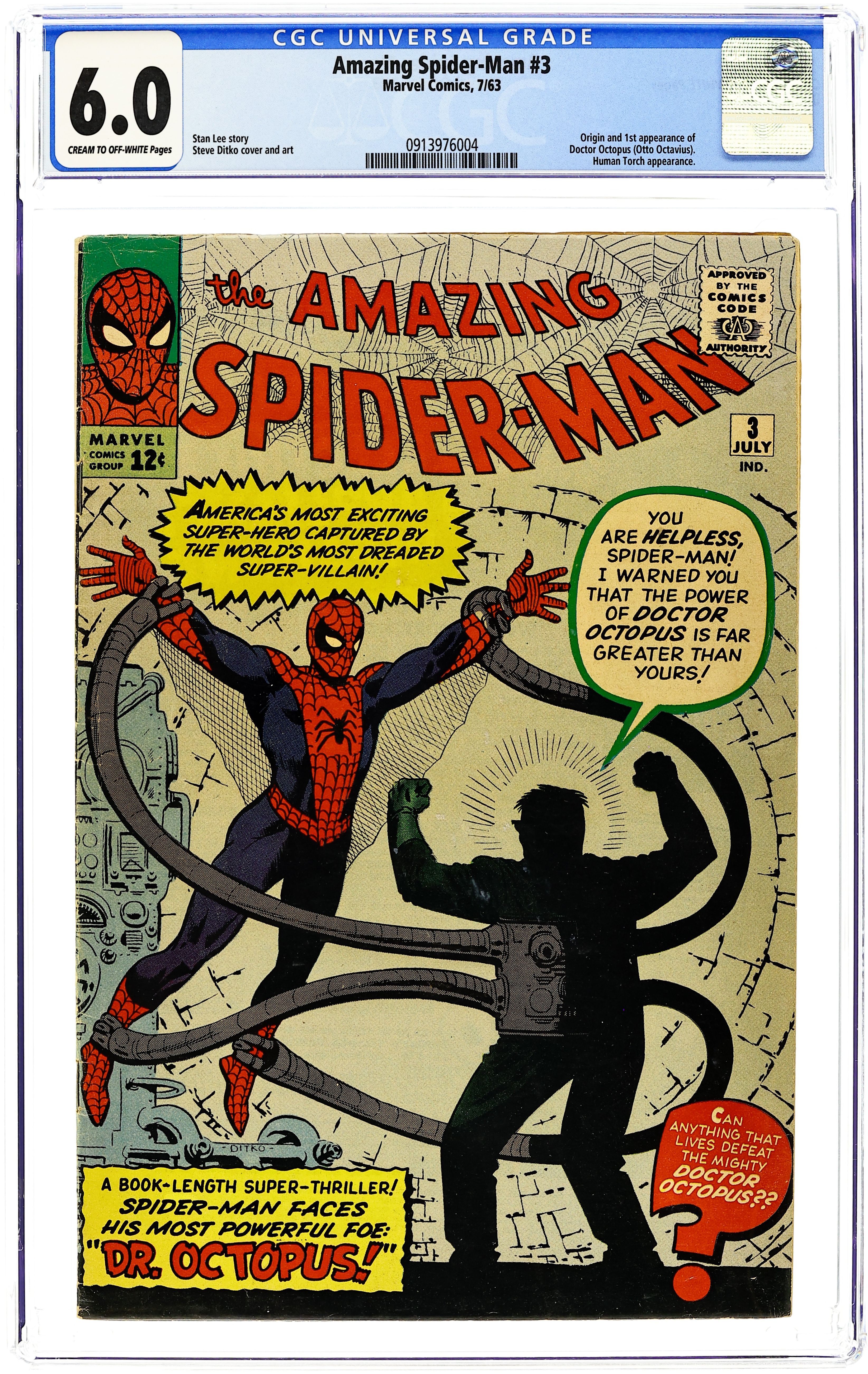 Ended Jul 15 2025 Bid History 21 bids Winning Bid $4,310 Cover art by Steve Ditko. First appearance of Dr. Octopus in Spider-Man Versus Doctor Octopus, script by Stan Lee, art by Steve Ditko; When an experiment goes wrong, Otto Octavius gains control of his robotic arms and decides to take over an atomic facility, but Spider-Man stops him. Spider-Man pin-up page by Ditko. Reprinted in Marvel Tales # 140. First issue with a letters column (including a letter by MyComicShop president Buddy Saunders!). 36 pgs. $0.12. Cover price $0.12. Grade: CGC 6.0 explanation of grade Condition: Used (collectible)