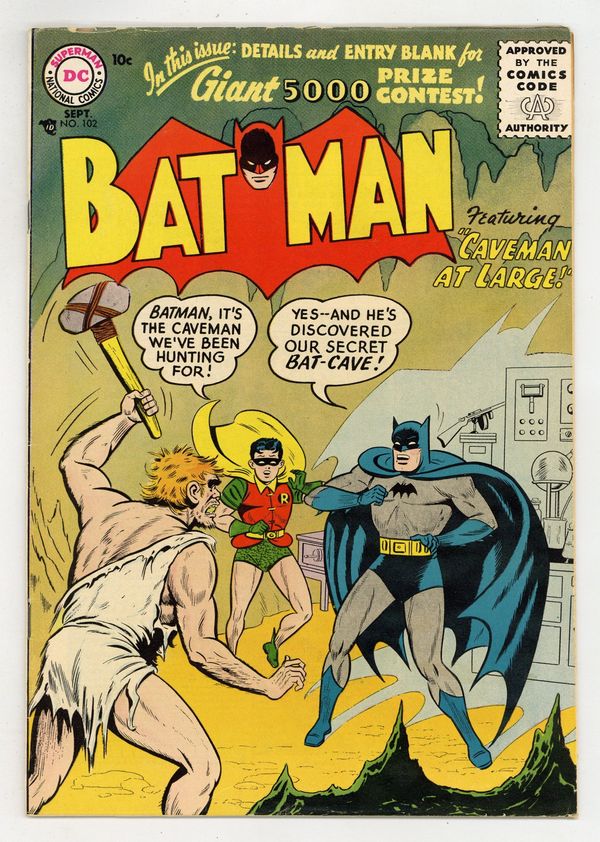 Cover by Sheldon Moldoff. "The House of Batman," pencils by Sheldon Moldoff, inks by Charles Paris; A wealthy man leaves money to Gotham to build a downtown HQ for Batman, but the Caped Crusader is surprised when the city builds as House of Batman for him. "The Batman from Babylon," script by Bill Finger, pencils by Dick Sprang, inks by Charles Paris; When Brand Bartor is arrested for dressing in a Batman costume, the crook turns the tables on the Caped Crusader by implying Batman should be arrested for impersonating a Babylonian Batman! "Scotland Yard's Search for a Stone" text story. Half-page Pretzels story by Phil Berube. "The Caveman at Large," script by Bill Finger, pencils by Sheldon Moldoff (as Bob Kane), inks by Charles Paris; A freak accident causes a great character actor to assume the character's persona he is dressed up to portray: a caveman! One-page Casey the Cop story by Henry Boltinoff. 36 Pages, Full Color. Cover price $0.10. Grade: VG 4.0 explanation of grade Condition: Used (collectible)