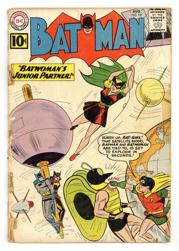 Cover by Sheldon Moldoff. "The Crimes of the Clockmaster," script by Jerry Coleman, pencils by Sheldon Moldoff, inks by Charles Paris; A strange clock arrives at Police HQ, which gives clues to up-coming crimes; Batman is able to correctly decipher the third clue in order to round up the Clockmaster. It's Fun to Serve! public service announcement, art by Bernard Baily. "The Race of Death," script by Bill Finger, pencils by Sheldon Moldoff, inks by Charles Paris; Batman and Robin are on the scene of the special Seth Baylor Cross Country race being held outside of Gotham City because they believe a murder will occur there. One-page Lefty Looie story by Henry Boltinoff. "Batwoman's Junior Partner," script by Bill Finger, art by Sheldon Moldoff; The publicity that Bat-Girl gets after having captured a criminal called the Moth results in the humiliated criminal seeking his revenge on her. 36 Pages, Full Color. Cover price $0.10. Grade: PR 0.5 explanation of grade Condition: Used (collectible)