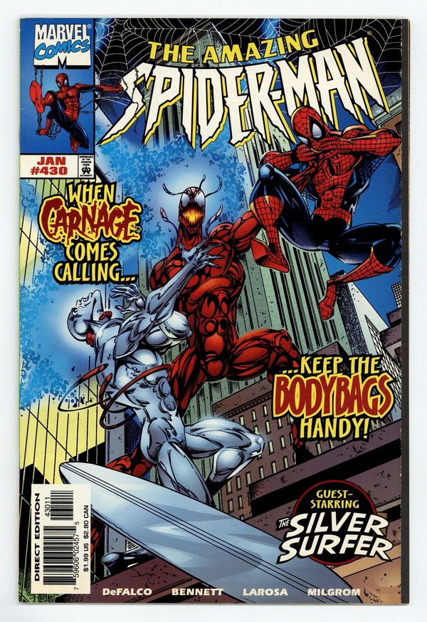 Ended Jul 28 2025 Bid History 7 bids Winning Bid $24 Direct Edition. Cover pencils by Tom Lyle, inks by Bud LaRosa. Carnage and the Silver Surfer guest star in "Savage Rebirth!", script by Tom DeFalco, pencils by Joe Bennett, inks by Bud LaRosa; Spider-Man rejoices that the Avengers have been confirmed to be alive; He begins dealing with the one million dollar reward the Bugle has on him; He heads toward the Baxter Building to visit the Fantastic Four, only to remember that the Thunder Bolts recently purchased the building; Peter agrees to quit being Spider-Man, as Mary meets up with Jill; Dr. Ashley Kafka, the new director of the Ravencroft Institute wants to shut down the microwave field holding back Cletus Kasady in order to cut costs. Cameos by Captain America, Iron Man, and the Vision. 38 pgs., full color. $1.99. Cover price $1.99. Grade: FN/VF 7.0 explanation of grade Condition: Used (collectible)