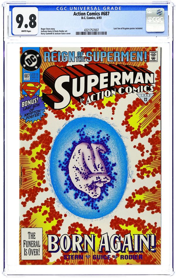 Ended Jul 17 2025 Bid History 10 bids Winning Bid $26 Cover by Kerry Gammill and Jackson Guice. Beginning the 'Reign of the Supermen,' continued from Adventures of Superman (1939) #500. The Last Son of Krypton returns to action, and this Superman has no qualms about taking a human life...so long as it's the right thing to do! Also, Pa Kent reacts to Superman's tougher techniques. Bound into the center of this issue is a double-page miniposter of Superman, printed on cover stock. Written by Roger Stern, with art by Jackson Guice and Denis Rodier. 40 pages, Full Color, $1.50. Cover price $1.50. Grade: CGC 9.8 explanation of grade Condition: Used (collectible)