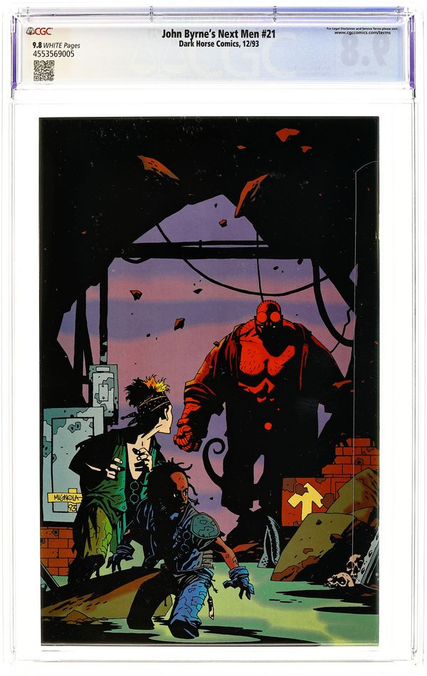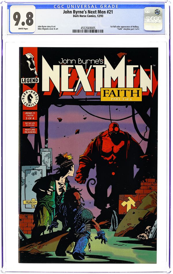 NOTE: 1st appearance of Mike Mignola's Hellboy (1st full app. in comic books) - Faith: Part 3 of 4 - Story and art by John Byrne. Cover by Mike Mignola. Guest-starring Hellboy. When Legends clash! (Or crossover!) Presenting the first "official crossover" within the Legend line -- the Next Men meet Mike Mignola's HELLBOY! Danny is actually the lucky one to have his path cross that of the World's Greatest Paranormal Investigator, in a segment drawn by guest Legend star Mike Mignola. Meanwhile, we present the life of Christ as seen through the eyes of Jack, whose imagination infuses the well-known story with some familiar faces. In the ongoing saga of Mark, a.k.a. MIV, we find out just what he's been doing during the missing seven years of his life. 36 pages, full color. Cover price $2.50. Grade: CGC 9.8 explanation of grade Condition: Used (collectible)