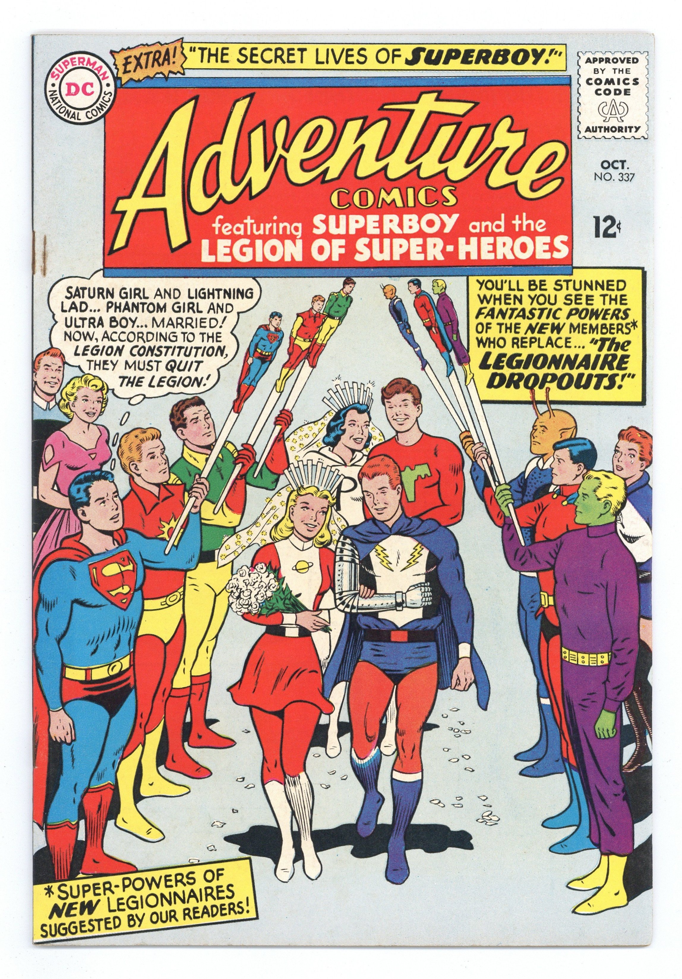 Ended Nov 17 7:08 PM CST Bid History 5 bids Winning Bid $14 Cover pencils by Curt Swan, inks by George Klein. The Weddings That Wrecked the Legion---Tales of the Legion of Super-Heroes, script by Edmond Hamilton, pencils by John Forte, inks by Sheldon Moldoff; Two pairs of Legionnaires marry, leaving membership spots open for some secret agents who plan to join in disguise; The secret agents turn on the Legionnaires, but find it was all a ruse to flush them out. The Secret Lives of Superbaby, art by John Sikela; Martha accidentally gives Lana a box with Superbaby momentoes. Rocky and Bullwinkle star in a one-page Cheerios ad. 36 Pages, Full Color. Cover price $0.12. Grade: VG/FN 5.0 explanation of grade Condition: Used (collectible)