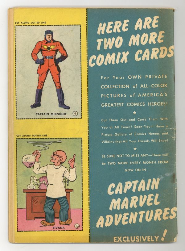Ended Aug 18 2025 Bid History 16 bids Winning Bid $52 Cover by C.C. Beck. Stories by Otto Binder, Joe Millard, Al Liederman and unknown. Art by C.C. Beck, Al Liederman and unknown. Captain Marvel (Billy Batson) stars in: "The Mummy Mystery"; "The Sky People" with story by Otto Binder; "The Revolt of the Shadows" by Joe Millard and C.C. Beck; and "The Hate Campaign" with story by Otto Binder. Plus: Paste the Axis Contest 3-pager with Captain Marvel strip by C.C. Beck. Also in this issue: Captain Kid in an untitled tale by Al Liederman. And: 2-page text story "Ticket to Eternity"! 68 Pages, Full Color. Cover price $0.10. Grade: PR 0.5 explanation of grade Condition: Used (collectible)
