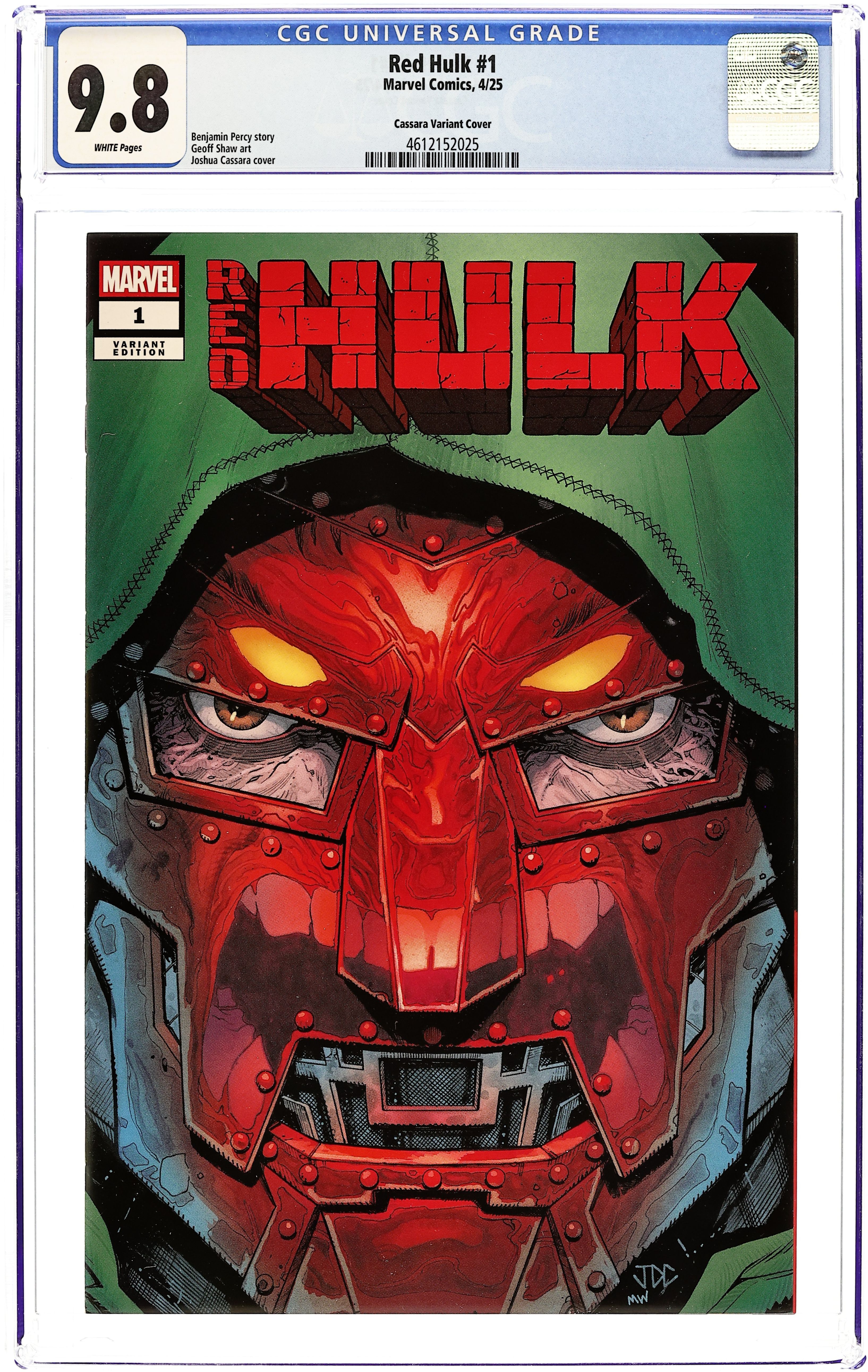 (W) Benjamin Percy (A) Geoff Shaw (CA) Joshua Cassara RED HULK RAGES INTO ONE WORLD UNDER DOOM! •THUNDERBOLT ROSS - in a cell deep below the ground - is a prisoner of DOCTOR DOOM And he is not alone. Brilliant military, criminal and political minds have been gathered against their will in a prison complex that serves as a "THINK TANK" to help carry out Doom's plan for global domination. But the RED HULK has other plans! Guest starring MACHINE MAN and DEATHLOK! Cover price $12.00. Grade: CGC 9.8 explanation of grade Condition: Used (collectible) unless item is a new release