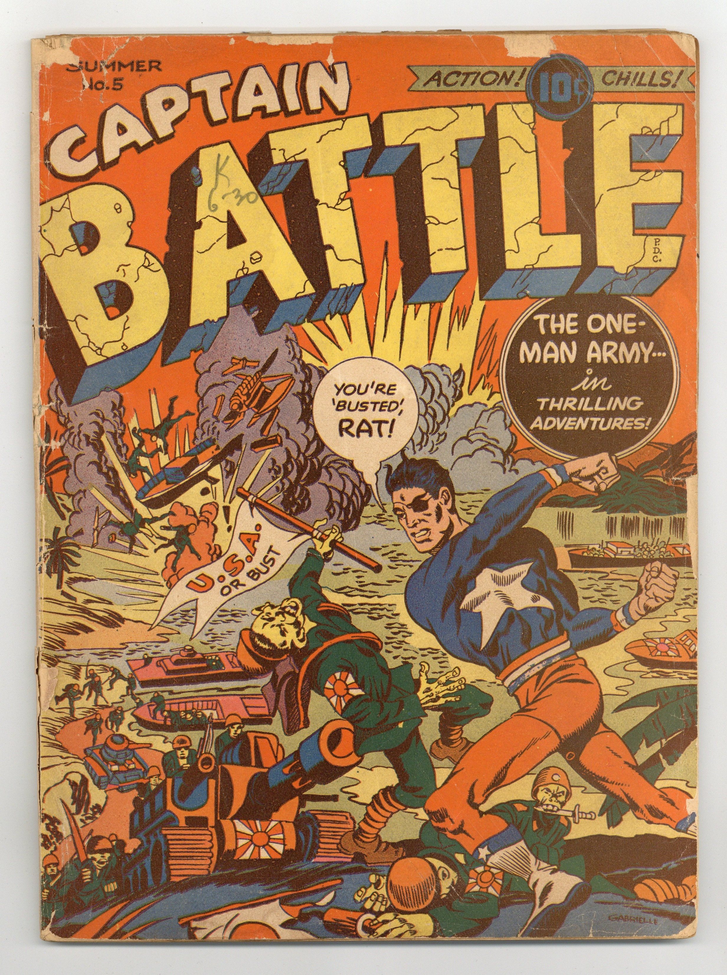 Cover by Al Gabrielle. Stories and art by Frank Borth, George Mandel, Jay Diger, Nathaniel Nitkin, Dennis Neville, Jack Warren and Don Rico. There was no issue #4; this issue features reprints of Captain Battle (1941) 1st Series #1. WWI veteran John Battle uses his advanced tech to battle fascism in WWII Europe. Undercover Man uses his talent for disguise to track and capture criminals. A lab accident transforms Yugoslavian scientist Basil Brusilof into the superhero Blackout. Captain Battle Conquers the Nazi Terror; Savior of Chungking; The League of Hooded Men; Drums Over Africa; Undercover Man; Gunner and Gupey; Avenger of the War Victims. Final issue of the series. 64 pages, Full Color. Cover price $0.10. Grade: PR 0.5 explanation of grade Condition: Used (collectible)