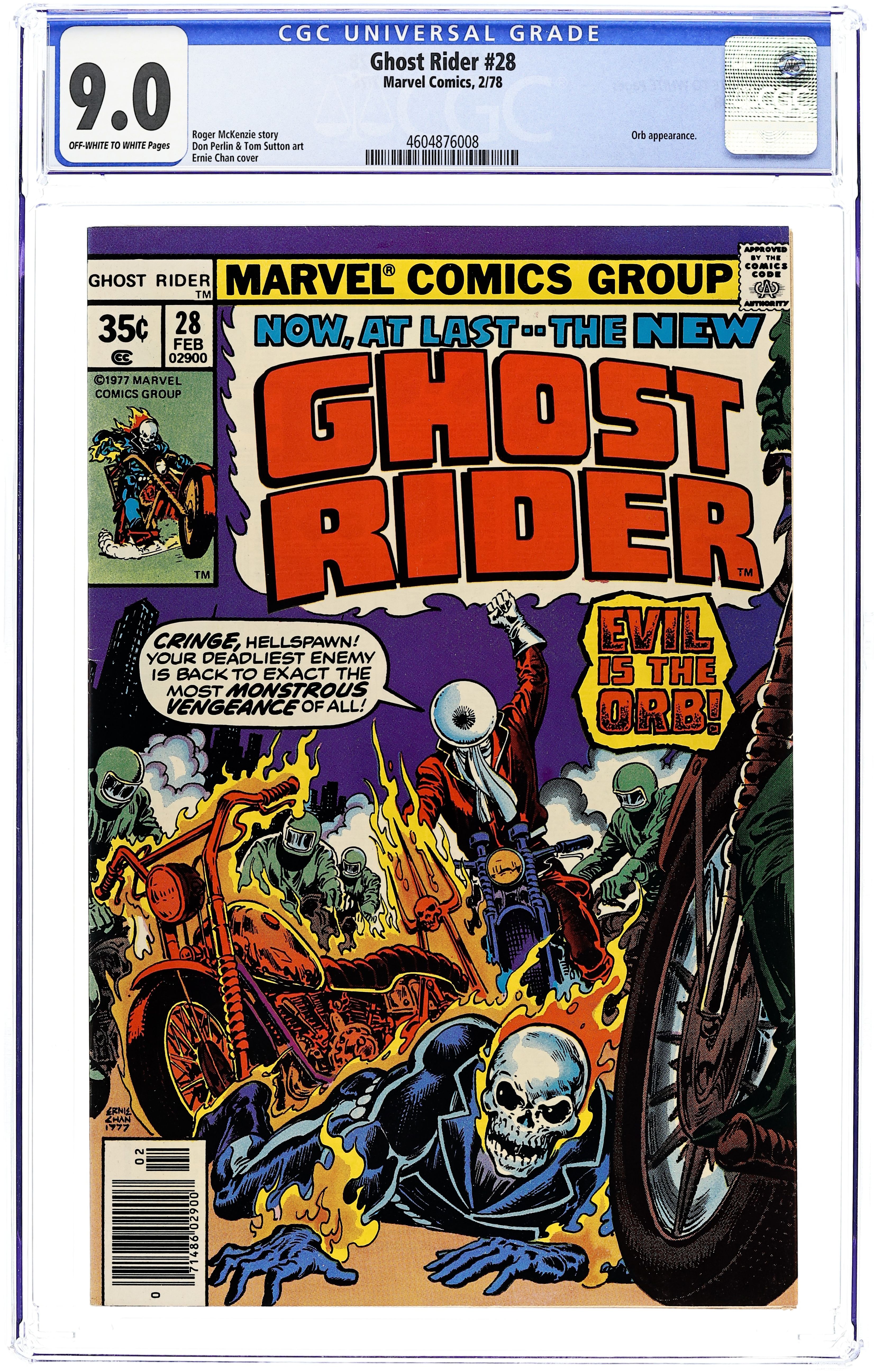 Ended Oct 27 2025 Bid History 7 bids Winning Bid $41 "Evil is the Orb!" Story by Roger McKenzie. Art by Don Perlin. Cover by Ernie Chan. The Uncanny Orb returns to plague Ghost Rider! 32 pages, FC. NOTE: Thor stars in Hostess ad "The Ding-A-Ling Family!" Cover price $0.35. Grade: CGC 9.0 explanation of grade Condition: Used (collectible)