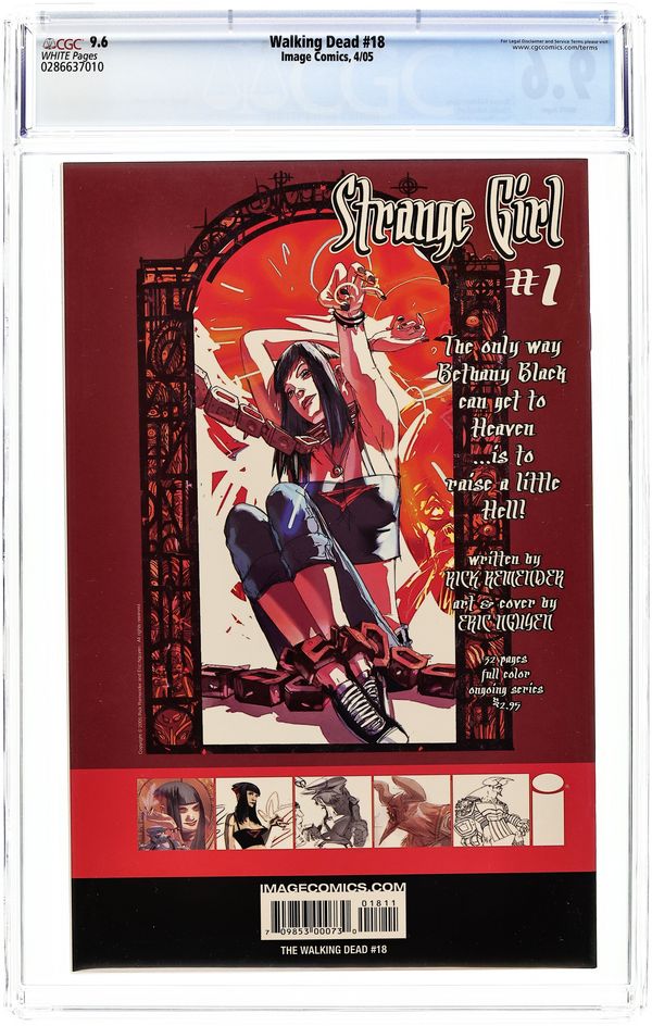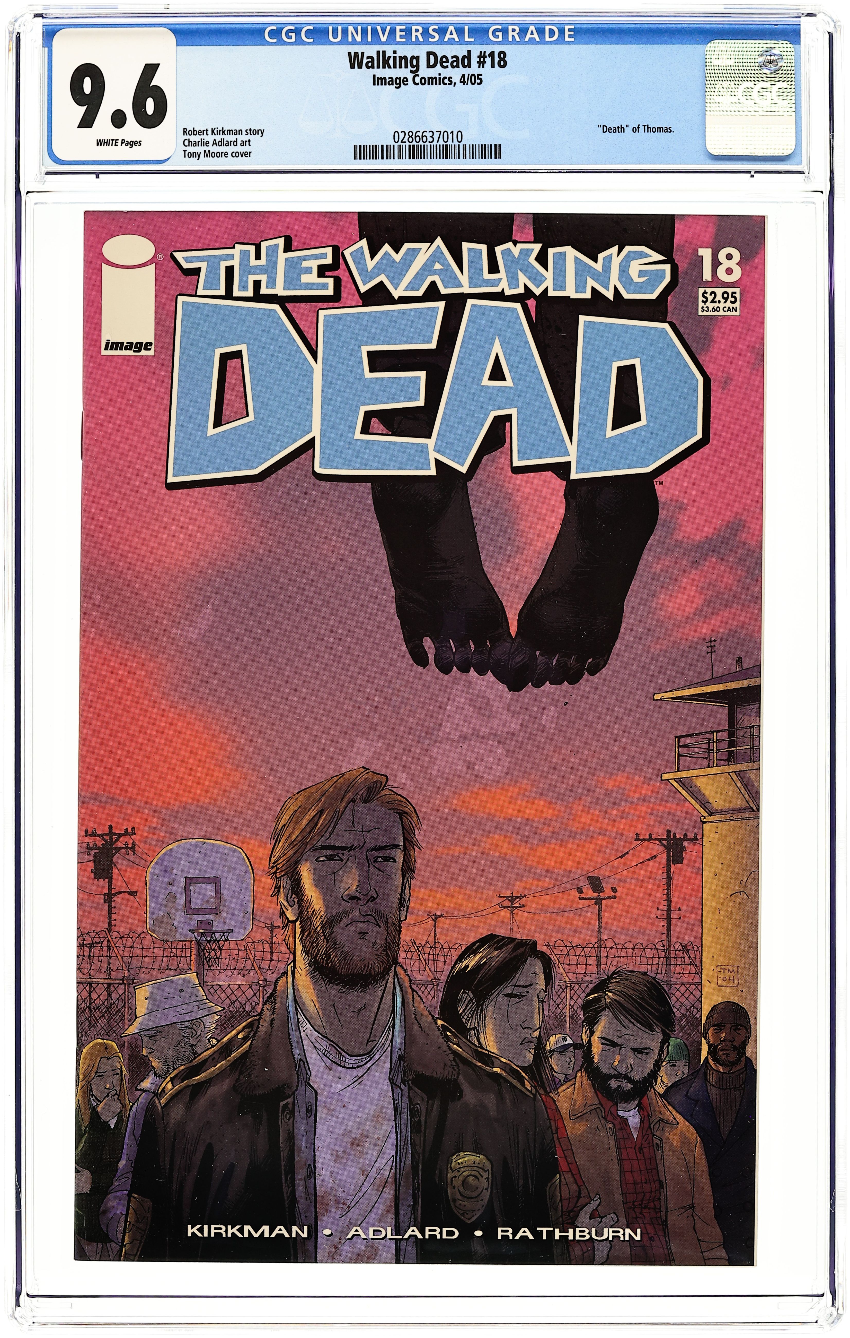 Ended Dec 1 10:08 PM CST Bid History 11 bids Winning Bid $38 on sale 03.02 $2.95 monthly ongoing series black & white 32 pages written by ROBERT KIRKMAN art by CHARLIE ADLARD cover by TONY MOORE CONCEPT: An epidemic of apocalyptic proportions has swept the globe, causing the dead to rise and feed on the living. In a matter of months, society has crumbled: There is no government, no grocery stores, no mail delivery, no cable TV. In a world ruled by the dead, we are forced to finally begin living. THIS ISSUE: Rick has gone over the edge. He's alienating everyone around him ? people he's come to know and trust, his family, his friends. Rick is becoming more and more isolated within the group. Where he goes from here will test the limits of his humanity. RETAILER WARNING: MAY NOT BE SUITABLE FOR ALL AGES Cover price $2.95. Grade: CGC 9.6 explanation of grade Condition: Used (collectible)