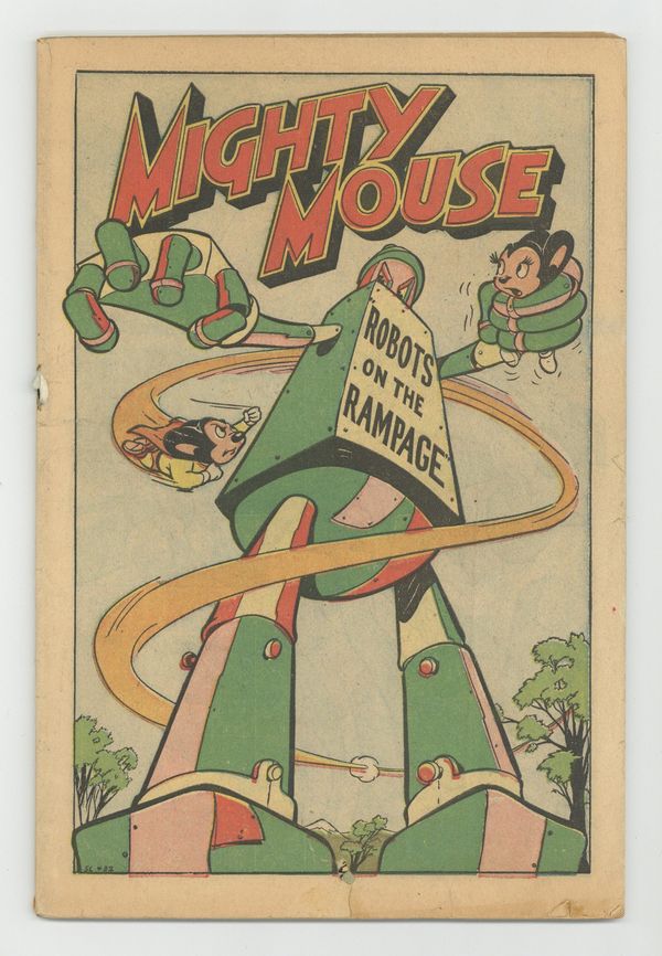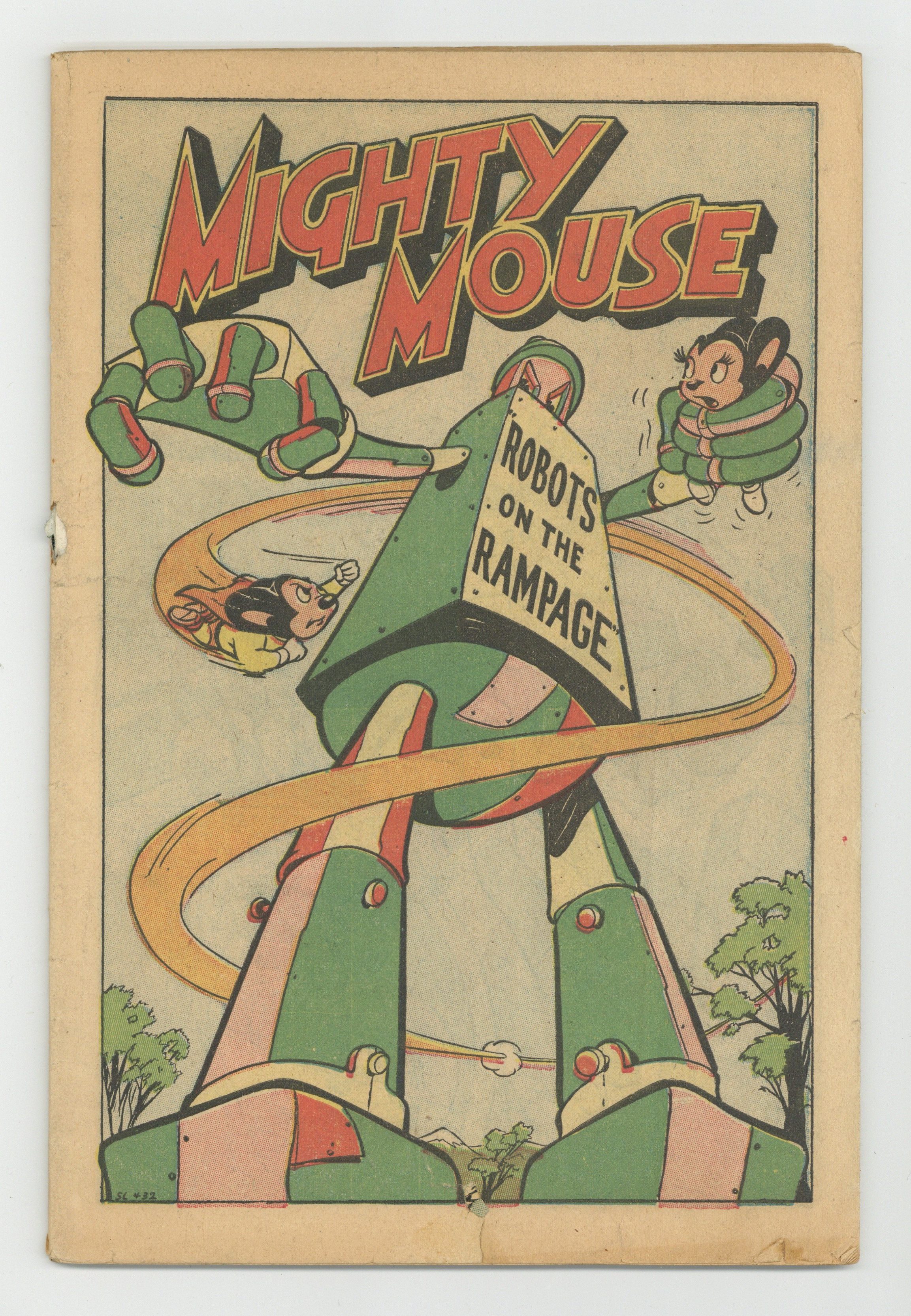 Cover by Frank Carin, Mario Acquaviva and Moe Worth. Stories by Stan Lee. Art by Frank Carin, Mario Acquaviva and Moe Worth. Stan Lee himself contributed some stories to this first series featuring the Terrytoons mouse superhero. Mighty Mouse comes to save the day when robots run amuck in Terrytown. When mousetraps start appearing in Terrytown and mice start disappearing, MM isn't sure if it's people or cats responsible. So he goes undercover as an ordinary mouse (with a fake beard and glasses) to investigate. Robots on the Rampage!; The Traps of Terror!; Free Competition; Andy and Bertie: Blazing Blades!; The Green Line!; Hi Kids!; A Day at the Lake! 32 pages, Full Color. Cover price $0.10. Grade: Coverless explanation of grade Condition: Used (collectible)