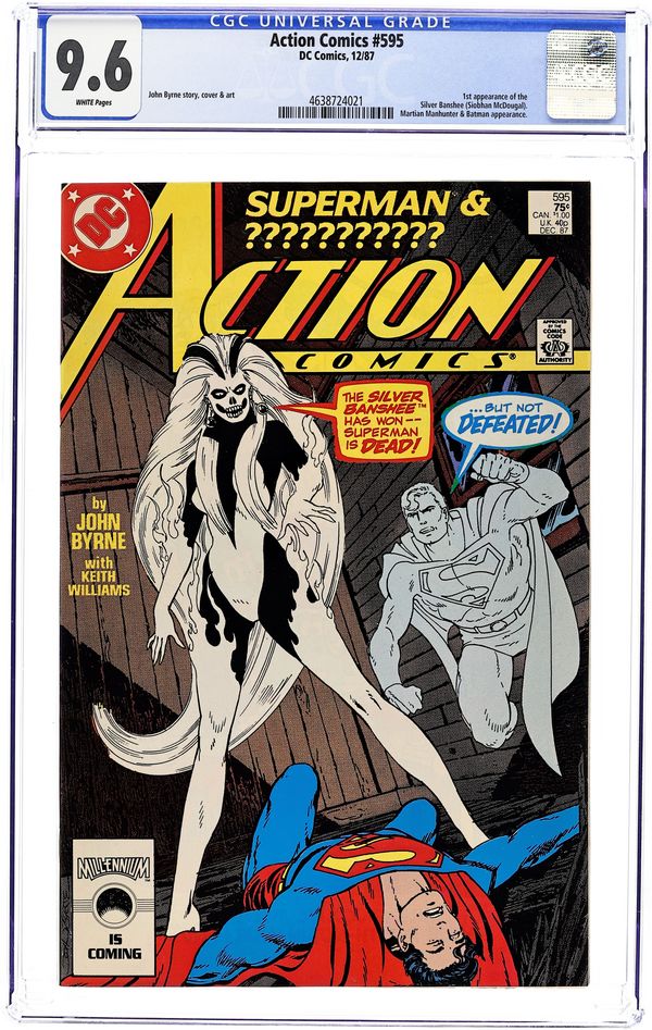 Direct Edition. Cover art by John Byrne. The Ghost of Superman starring Superman and the Martian Manhunter, script and pencils by John Byrne, inks by Keith Williams; to stop the Silver Banshee, Superman fakes his death. 36 Pages, Full Color, $0.75. Cover price $0.75. Grade: CGC 9.6 explanation of grade Condition: Used (collectible)