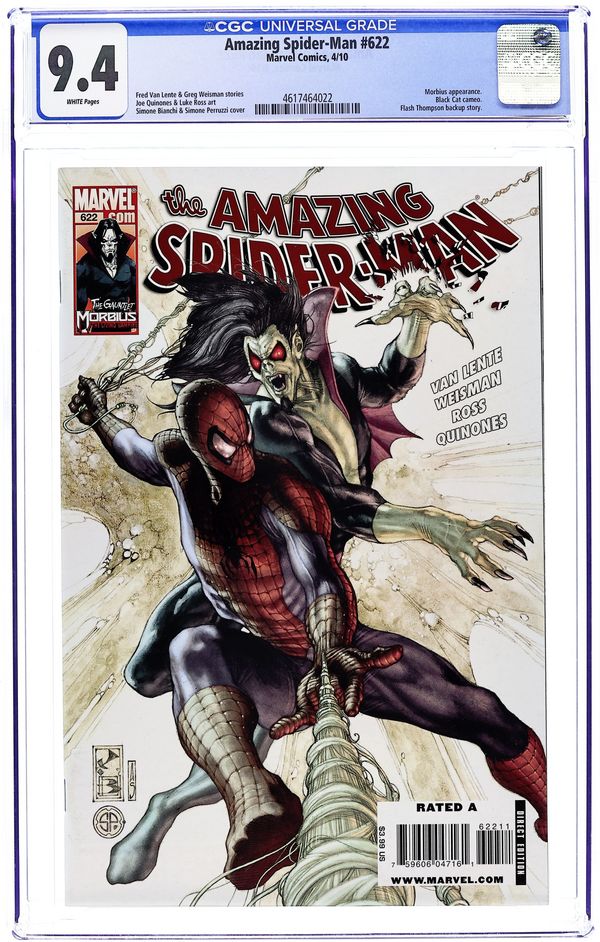 Starts Jan 26 The Gauntlet: Part 8 - Written by GREG WEISMAN and FRED VAN LENTE. Art by LUKE ROSS and JOE QUINONES. Cover by SIMONE BIANCHI. As the Gauntlet rages on around him, the spotlight is on Peter Parker's original archenemy-turned-best friend, Flash Thompson. Since losing his legs in service to his country, Flash Thompson's not been deterred by his physical limitations. But even a hero can have his limits. Greg Weisman, one of the brains behind the smash TV hit Spectacular Spider-Man, teams with Luke Ross (CAPTAIN AMERICA) to bring a touching story of Flash Thompson coming to terms with his new life. Then, Fred Van Lente and Joe Quinones (WEDNESDAY COMICS) bring Spider-Man face-to-face with Morbius, The Living Vampire! 44 Pages full color. Cover price $3.99. Grade: CGC 9.4 explanation of grade Condition: Used (collectible)