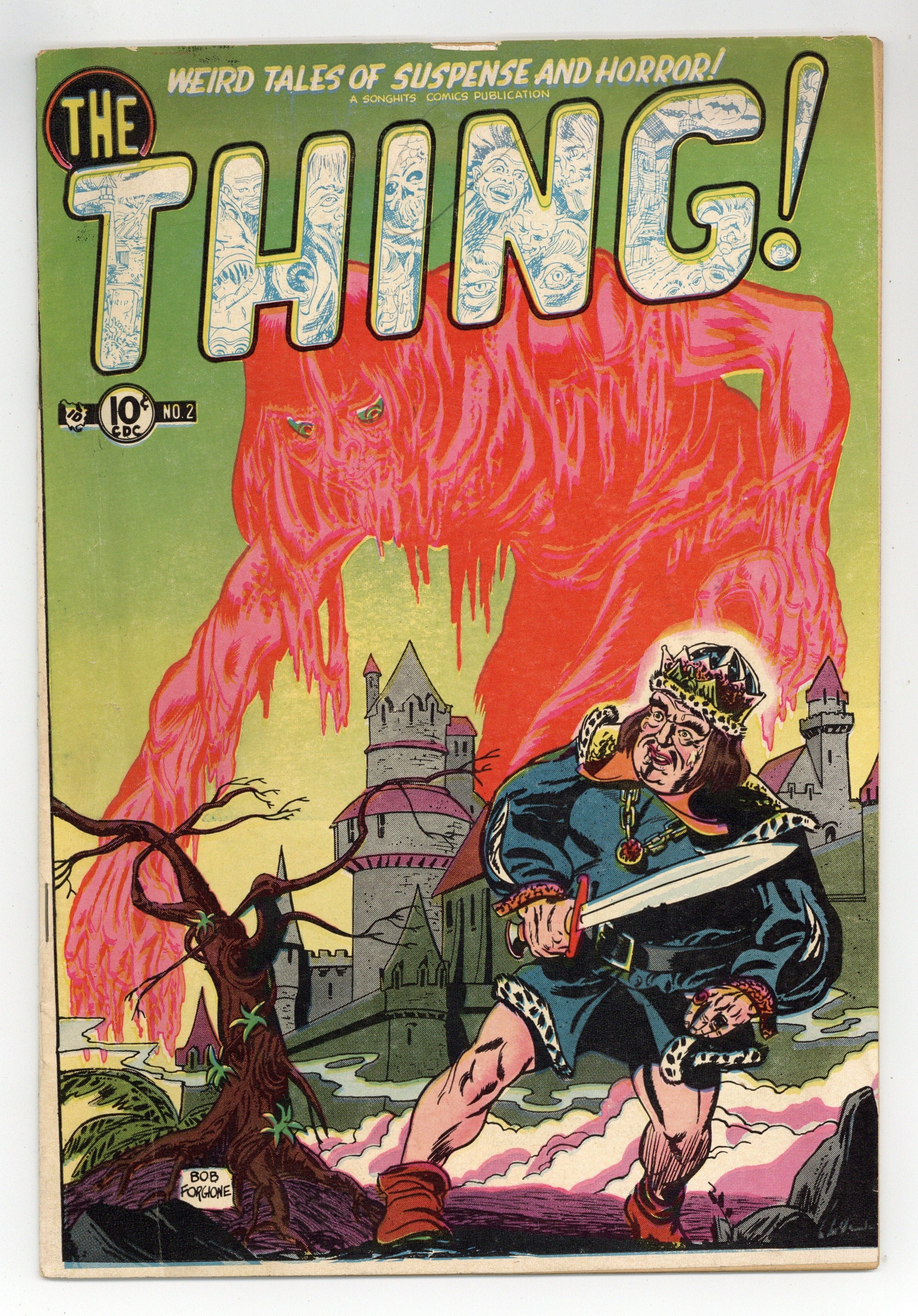 Cover by Bob Forgione. "The Red Death," art by Bob Forgione; A terrible and deadly plague ravages a medieval king's land; While his peasants die, the king holds a masquerade ball. 'El Toro Diablo,' pencils by Albert Tyler, inks by Bob Forgione; A boy with the looks and the horns of a bull becomes famed matador Tomas Hernandez. "The Witch's House" text story. "The Creature," pencils by Albert Tyler, inks by Bob Forgione; The earth is befallen by mysterious cancerous growths. "The White Rat"; A doctor is bullied by his strong assistant; He invents a muscle growth serum and goes for payback. 36 pgs., full color. $0.10. Cover price $0.10. Grade: VG- 3.5 explanation of grade Condition: Used (collectible)