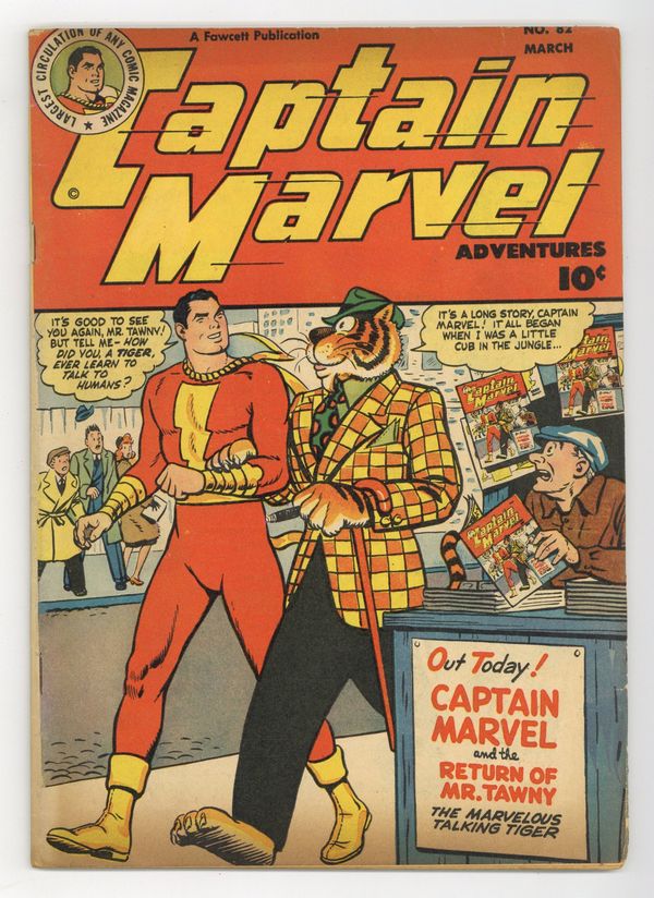 Cover by C.C. Beck. Stories by Bill Woolfolk, Otto Binder and unknown. Art by C.C. Beck, Pete Costanza and unknown. Captain Marvel (Billy Batson) stars in: "Sivana Meets Aunt Minerva" with story by Bill Woolfolk; "The Streamlining of Captain Marvel" with story by Bill Woolfolk; "The Medieval Demon" with story by Bill Woolfolk; and "The Return of Mr. Tawny" by Otto Binder, C.C. Beck and Pete Costanza. Plus: Captain Kid in "Adventure on a Scaffold." And: Jon Jarl in the 2-page text story "Hobo of the Void" with script by Otto Binder (as Eando Binder). 52 Pages, Full Color. Cover price $0.10. Grade: GD/VG 3.0 explanation of grade Condition: Used (collectible)