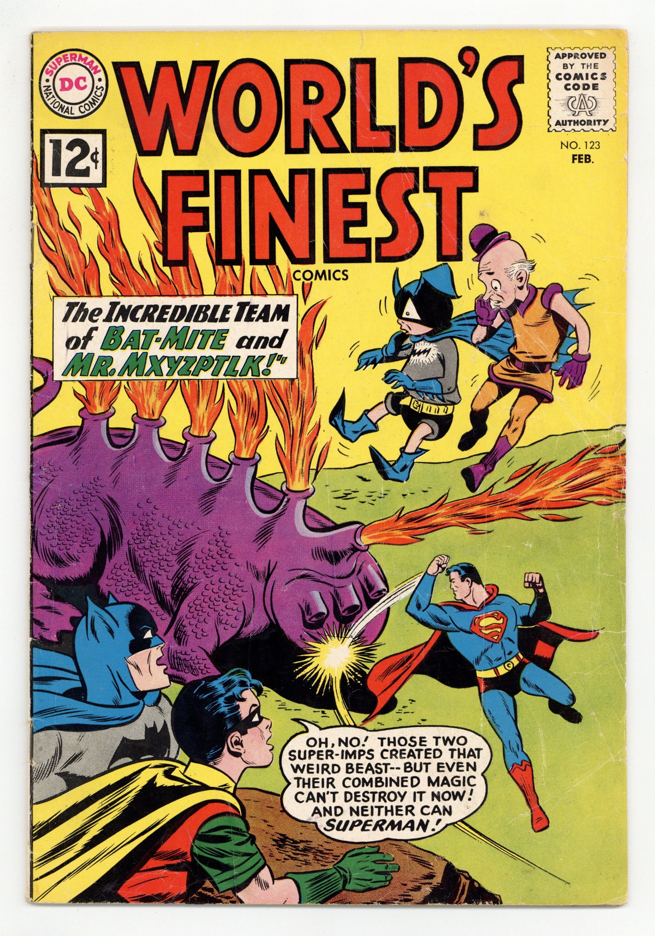 Starts Feb 9 Cover pencils by Dick Dillin, inks by Sheldon Moldoff. The Incredible Team of Bat-Mite and Mr. Mxyzptlk starring Superman and Batman, script by Jerry Coleman, pencils by Dick Sprang, inks by Sheldon Moldoff; Mxyzptlk and Bat-Mite discover when they use their magic together they can't control the outcome. The Day They Grounded Tommy Tomorrow, script by Jack Miller, art by Jim Mooney. Ollie humor page by Henry Boltinoff. The Man Who Foretold Disaster starring Green Arrow, script by Dick Wood, art by Lee Elias; Prof Marlo claims to be able to foretell disasters. Statement of ownership--average paid circulation 480,000. 36 Pages, Full Color. Cover price $0.12. Grade: GD/VG 3.0 explanation of grade Condition: Used (collectible)