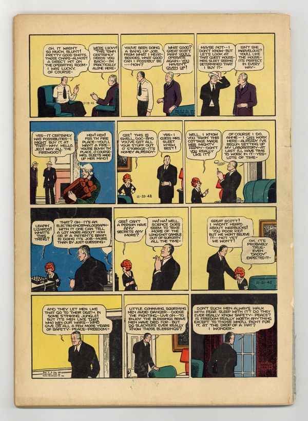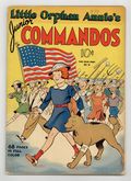 Starts Apr 4 Beautiful World War II patriotic flag cover. Indicia title is "LITTLE ORPHAN ANNIE'S JUNIOR COMMANDOS, No. 18." Untitled Little Orphan Annie story, script and art by Harold Gray; Annie organizes the local kids into the "Junior Commandos" to do homefront war work like collecting scrap and selling war bonds; Annie befriends Mrs. Sleet, a bitter old woman who lost her son and husband in "the last war" (World War I); Doc Zee joins the Army and Annie comes to live with Mrs. Sleet, who she now refers to as "Auntie Priss"; A hardbitten refugee boy called Driftwood comes to live in the house; Later Annie uncovers a German Fifth Column operation; A brief cameo of Daddy Warbucks fighting in Asia, then back to Annie and the kids watching a sub attack a ship, whose captain is Annie's old friend Shanghai Peg; Later Annie hears a radio report that Warbucks and his company had been killed in battle; Doc Zee returns from the war, minus an arm. Flag Cover; reprints strips from 6/14/42 to 11/21/42. 68 pages, full color. Cover price $0.10. Grade: GD/VG 3.0 explanation of grade Condition: Used (collectible)