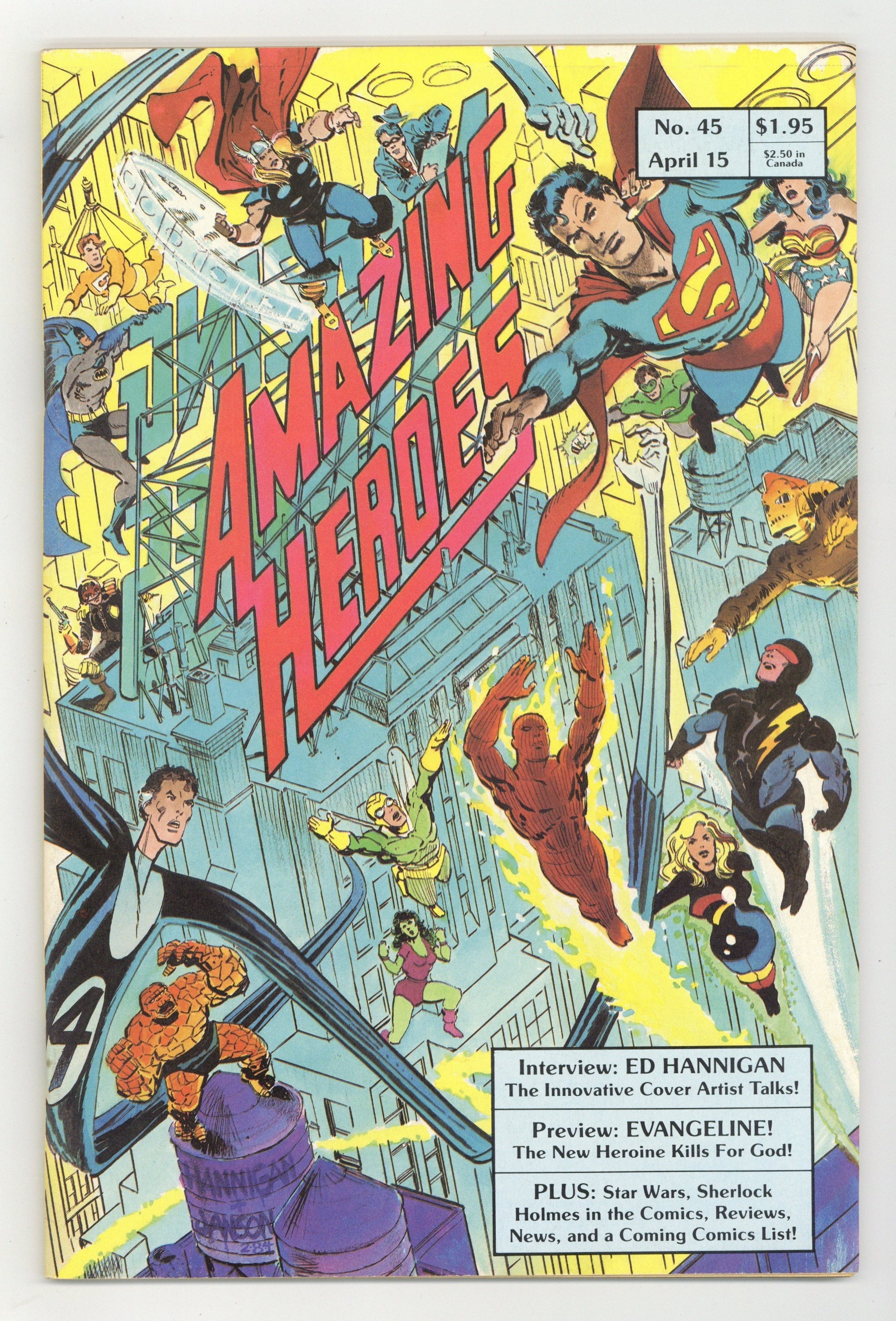 Starts Feb 16 In this issue: Interview with Ed Hannigan; preview of Comico's Evangeline; Sherlock Holmes' comics career. Plus: Editorial; Star Wars comic strip by Archie Goodwin and Al Williamson; Newsflashes; Silly Cover - Art Clokey's Gumby by Jim Chadwick; Coming Comics; Top 100 Comics; Comics in Review by R.A. Jones - Moon Knight, Ms. Mystic, The Guardian, Mage, Amazing Spider-Man; Space Ace - a look at the videogame; Amazing Readers. Cover by Ed Hannigan and Klaus Janson features Superman, Thor, Batman, Fantastic Four, Wonder Woman, Halo, Green Lantern, She-Hulk, E-Man, The Spirit, Judge Dredd, The Fly, The Rocketeer and Nexus. Cover price $1.95. Grade: FN+ 6.5 explanation of grade Condition: Used (collectible)