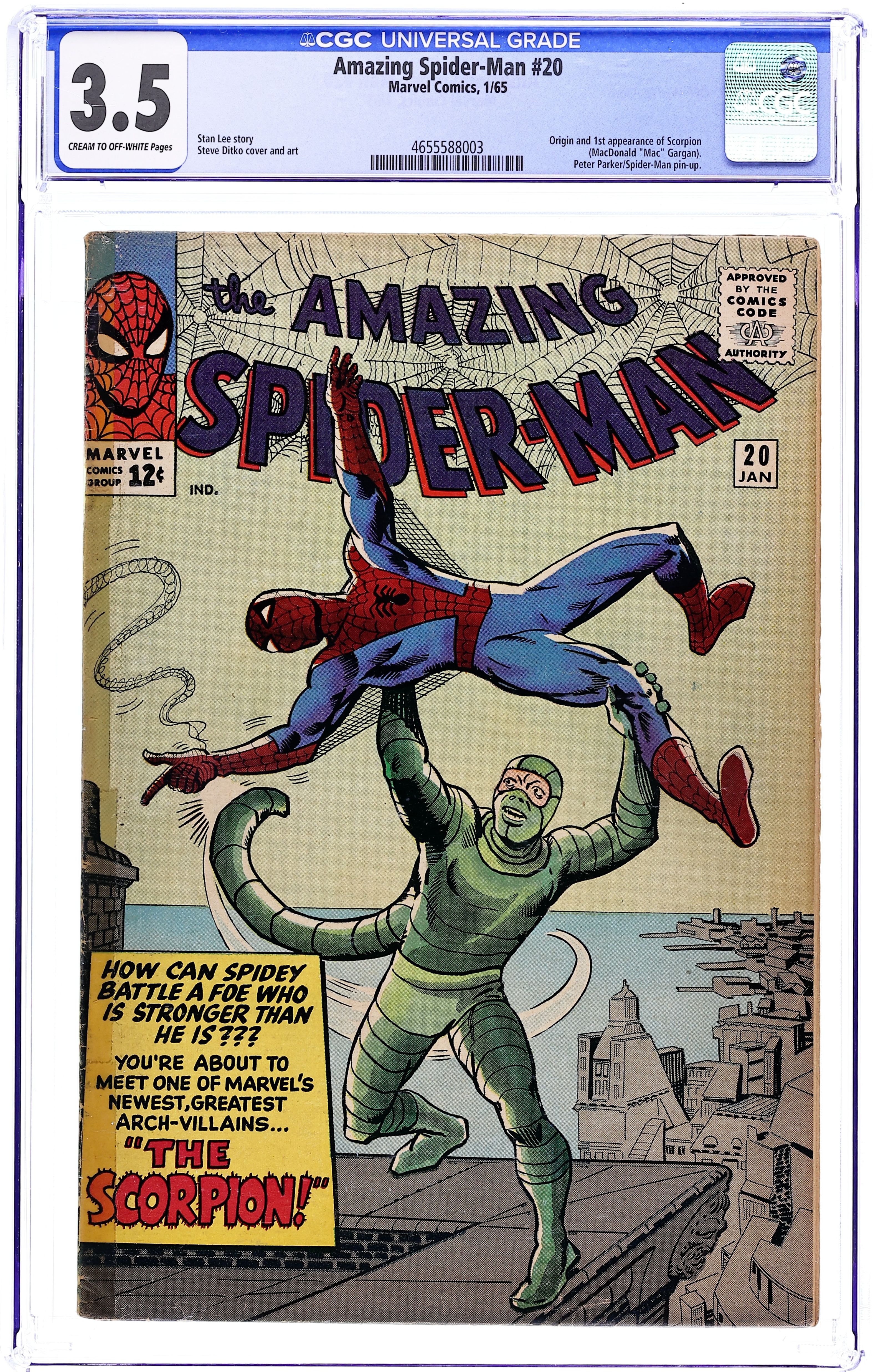 Cover art by Steve Ditko. First appearance of the Scorpion in The Coming of the Scorpion!, script by Stan Lee, art by Steve Ditko; J. Jonah Jameson pays Dr. Stillwell to turn Mac Gargan into the Scorpion to try to capture Spider-Man. Stillwell's formula makes Gargan become more evil than he originally was and the Scorpion goes on a rampage and is finally stopped by Spider-Man. Reprinted in Marvel Tales # 15 and 158. 36 pgs. $0.12. Cover price $0.12. Grade: CGC 3.5 explanation of grade Condition: Used (collectible)