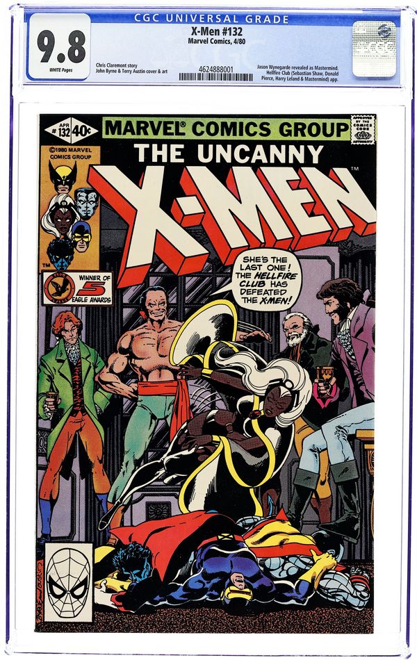 Direct Edition. The Dark Phoenix Saga: Part 4 of 9 - "And Hellfire is Their Name!" Story by Chris Claremont and John Byrne. Art by John Byrne and Terry Austin. Deciding to become proactive, the X-Men attempt to infiltrate the Hellfire Club's inner sanctum. However, they soon discover that they may have played right into the hands of their mysterious foes when they run into the Inner Circle of the Hellfire Club. Plus, the startling true identity of the mysterious Jason Wyngarde is revealed! NOTE: 1st appearance of Sebastian Shaw, Donald Pierce, and Harry Leland. 36 pgs. Cover price $0.40. Grade: CGC 9.8 explanation of grade Condition: Used (collectible)