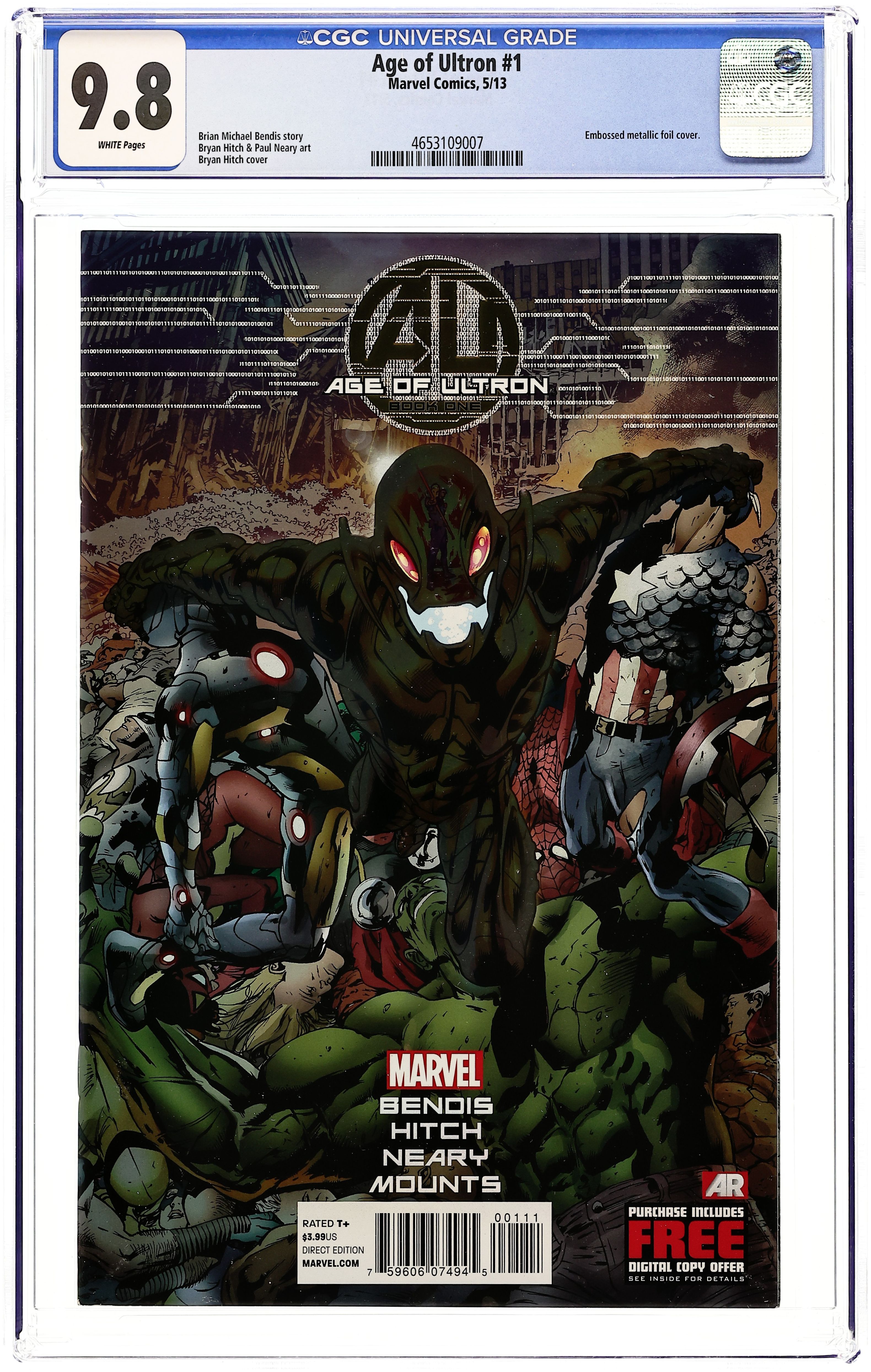 Ended Dec 1 7:08 PM CST Bid History 7 bids Winning Bid $32 Foil Cover by Bryan Hitch. Written by Brian Michael Bendis. Art by Bryan Hitch. For years the heroes of the Marvel Universe have lived in fear that the artificial intelligence known as Ultron would one day evolve to fulfill its desire to wipe out all organic life and take over the Earth -- that day has arrived. Cover price $3.99. Grade: CGC 9.8 explanation of grade Condition: Used (collectible)
