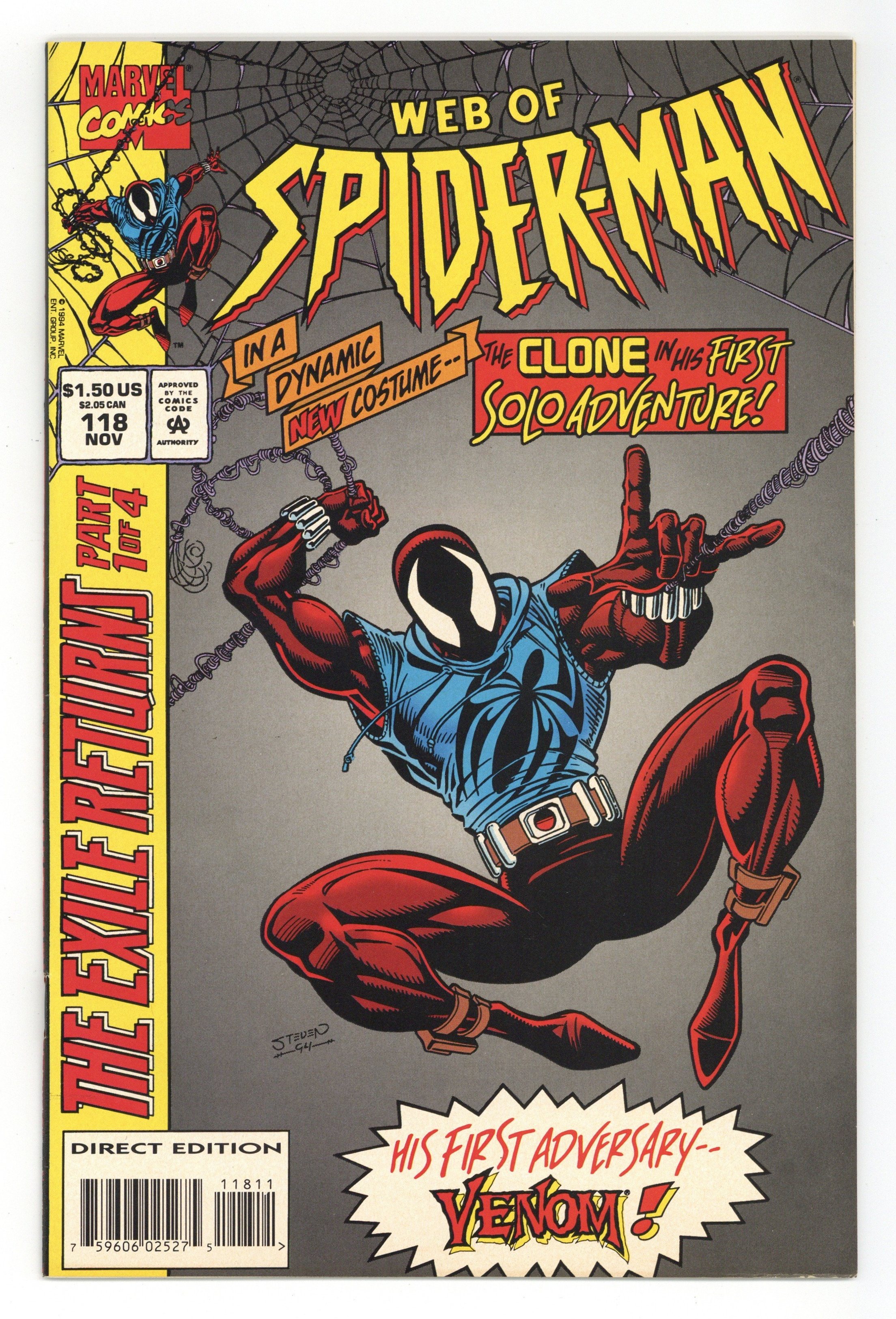 First Printing. Direct Edition. "Exiles Return Part 1 of 4: Memories" Written by Terry Kavanagh. Pencils by Steve Butle. Inks by Randy Emberlin. Venom and Clone appear. Note: First appearance of Ben Reilly as the Scarlet Spider. Cover price $1.50. Grade: FN/VF 7.0 explanation of grade Condition: Used (collectible)