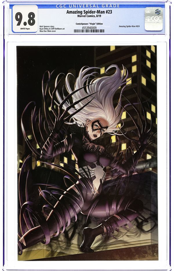 ComicXposure exclusive Virgin cover by Woo Dae Shim. Written by Nick Spencer. Art by Ryan Ottley. 'HUNTED' now runs through AMAZING SPIDER-MAN #23! The fallout from 'HUNTED' is felt and much of Peter's life is called into question. What is left of Spider-Man after living through the harrowing hunt?! 36 pages full color. Rated T Grade: CGC 9.8 explanation of grade Condition: Used (collectible)