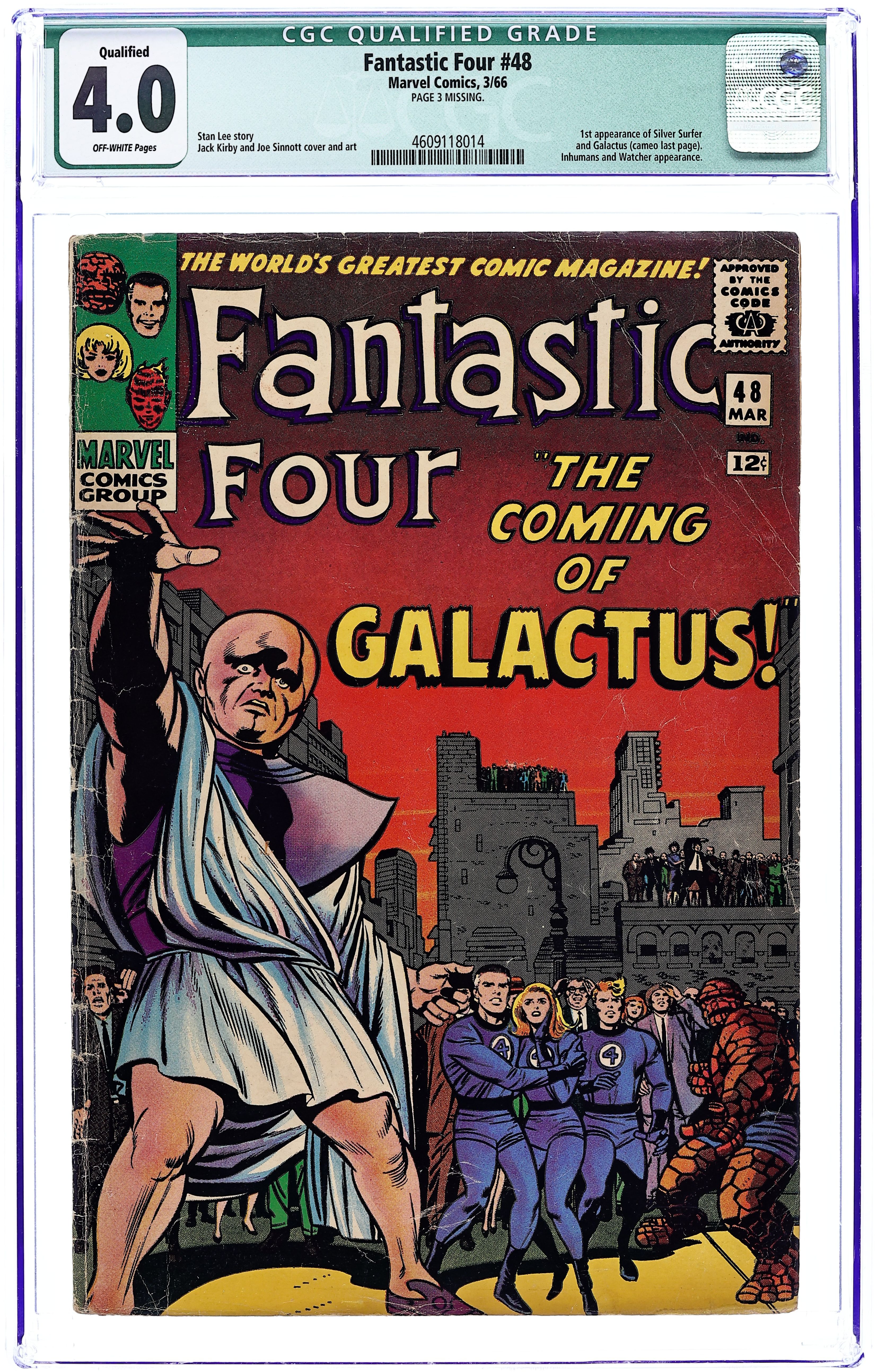 Starts Apr 4 Cover pencils by Jack Kirby, inks by Joe Sinnott. First appearance of Galactus and the Silver Surfer in one of the most famous stories of the Silver Age, The Coming of Galactus!, script by Stan Lee, pencils by Jack Kirby, inks by Joe Sinnott; Black Bolt and the Fantastic Four put an end to Maximus's plan to destroy all the humans; Once the Fantastic Four return to New York the Watcher tells them of the coming danger of Galactus. Letter to the editor from comics writer Don McGregor. 36 pages, full color. Cover price $0.12. Grade: CGC 4.0 explanation of grade Condition: Used (collectible)