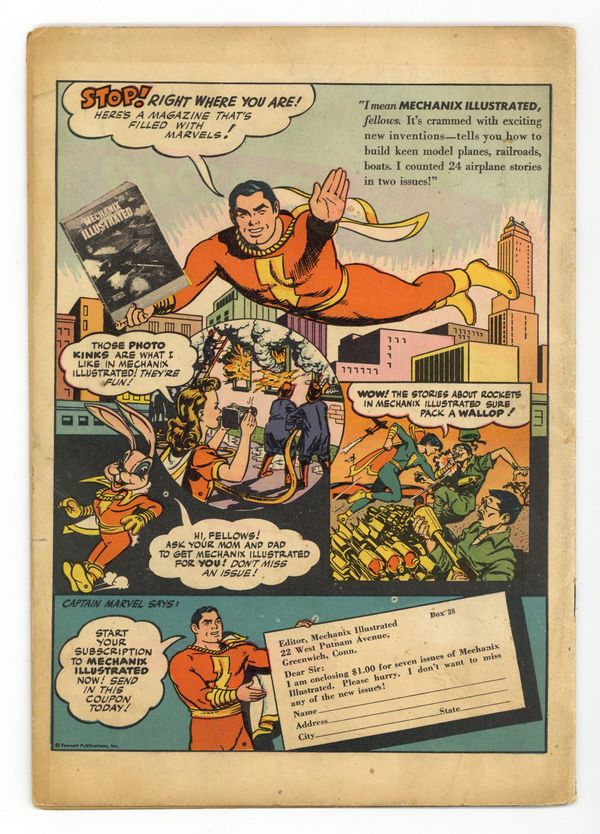 Cover by C. C. Beck. Stories and art by Otto Binder, C. C. Beck, Charlie Tomsey, and Harry Parkhurst. The Fawcett comic that introduced the original Captain Marvel (Shazam) to the world. Captain Marvel must travel to the planet Mercury to avert a disaster. Spy Smasher seeks a hidden Axis base in the Sierra Nevadas, but if he gets caught, mines and "robot bombs" will destroy everything. When the Tulsa Kid hides out by dressing as a woman, Golden Arrow likewise dresses in drag to catch him! Captain Marvel: Mission to Mercury; Golden Arrow: The Weaker Sex; Kaput Was the Word for It; Spy Smasher: The Nest of Spies; Horace Hotstuff; Whipper-Snappers; Ibis the Invincible: The Noose of Death. 32 pages, Full Color. Cover price $0.10. Grade: GD 2.0 explanation of grade Condition: Used (collectible)