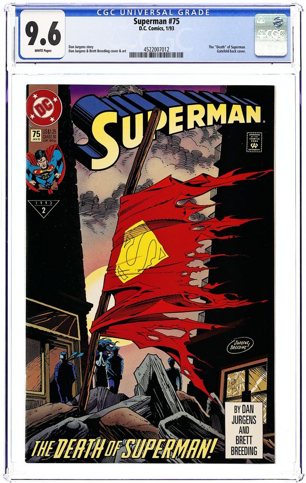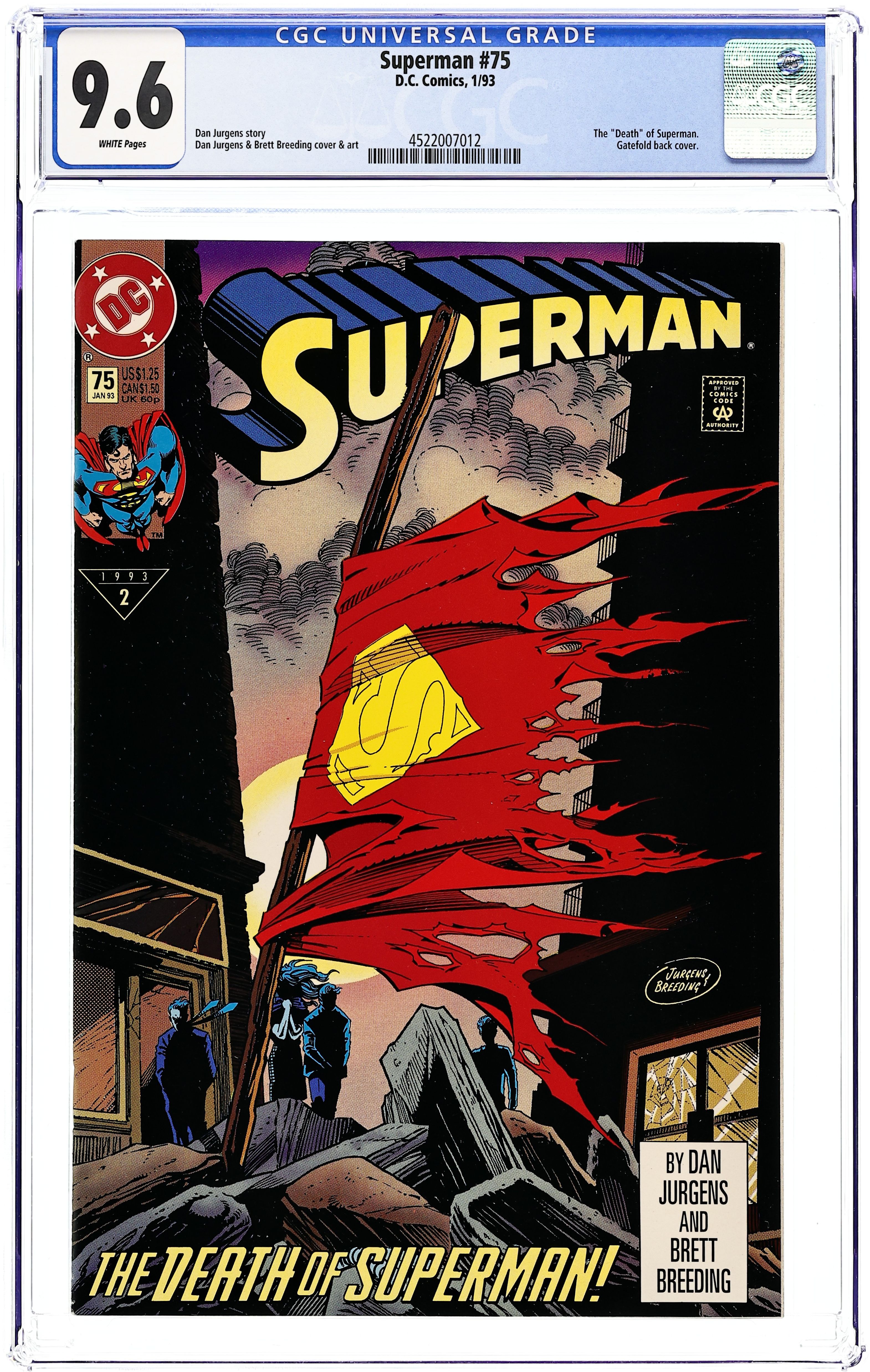 1st printing. Doomsday! Part 7 of 7. "Doomsday!" Story by Dan Jurgens. Art by Dan Jurgens and Brett Breeding. Here it is, the issue that rocked the DC Universe. An unstoppable force named Doomsday crash landed on Earth and has cut a swath of death and destruction across the country, all the way to Metropolis. Even the Justice League, the world's premiere super-team, was powerless before this creature's might. Now one man stands defiantly in Doomsday's way and vows that the creature's insanity stops here. Superman fights his strongest opponent to the death in the streets of Metropolis. Cover price $1.25. Grade: CGC 9.6 explanation of grade Condition: Used (collectible)
