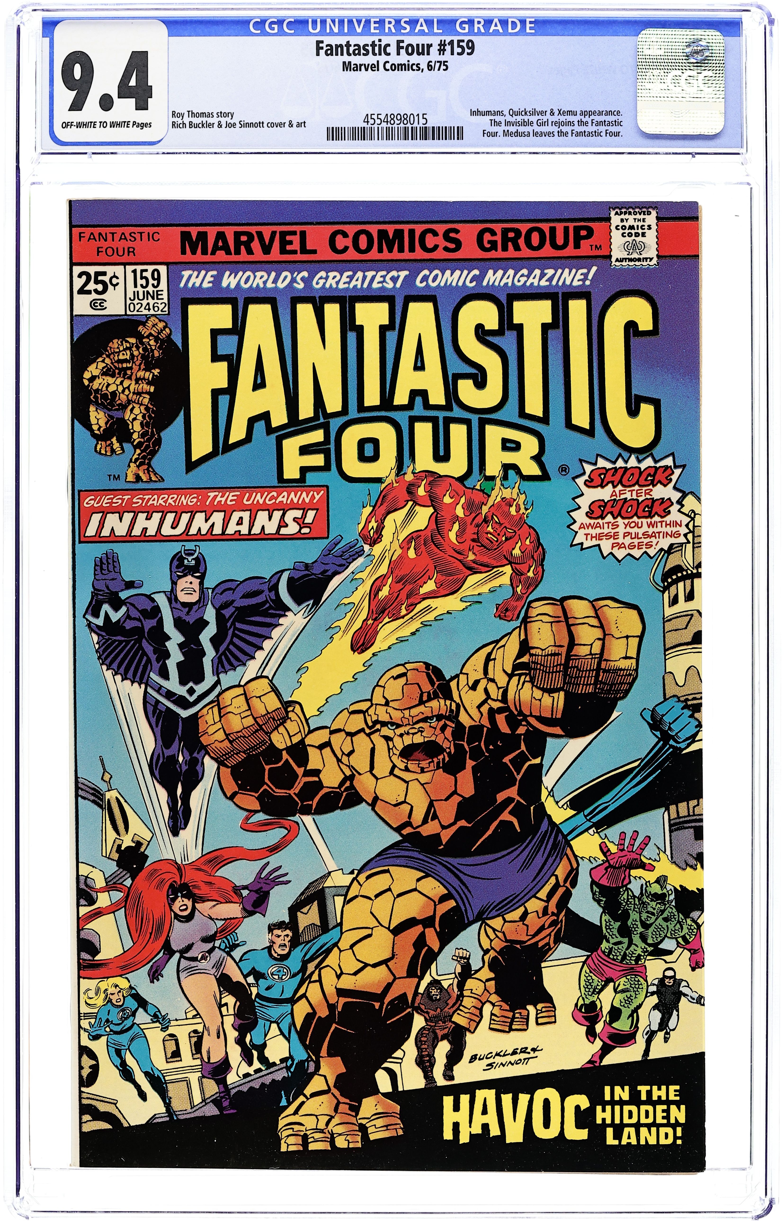 "Havoc in the Hidden Land!" Part 2 of 2. Guest-starring the Inhumans. Script by Roy Thomas. Art by Rich Buckler (breakdowns) and Joe Sinnott (finishes). Cover by Rich Buckler and Joe Sinnott. One of the best Fantastic Four covers of the bronze age as the FF storm into the Great Refuge to free the royal family! Can the fabulous foursome accomplish their mission before Xemu forces Black Bolt to speak into the Thunder Horn? An invisible stowaway on the flight to the Hidden Land holds the key to victory! (Notes: In this issue Medusa returns to the Inhumans and the Invisible Girl rejoins the FF. Also, the Human Torch switches back to his traditional blue FF uniform. The letters page contains Marvel Value Stamp series A #84 Doctor Doom.) 36 pages Cover price $0.25. Grade: CGC 9.4 explanation of grade Condition: Used (collectible)