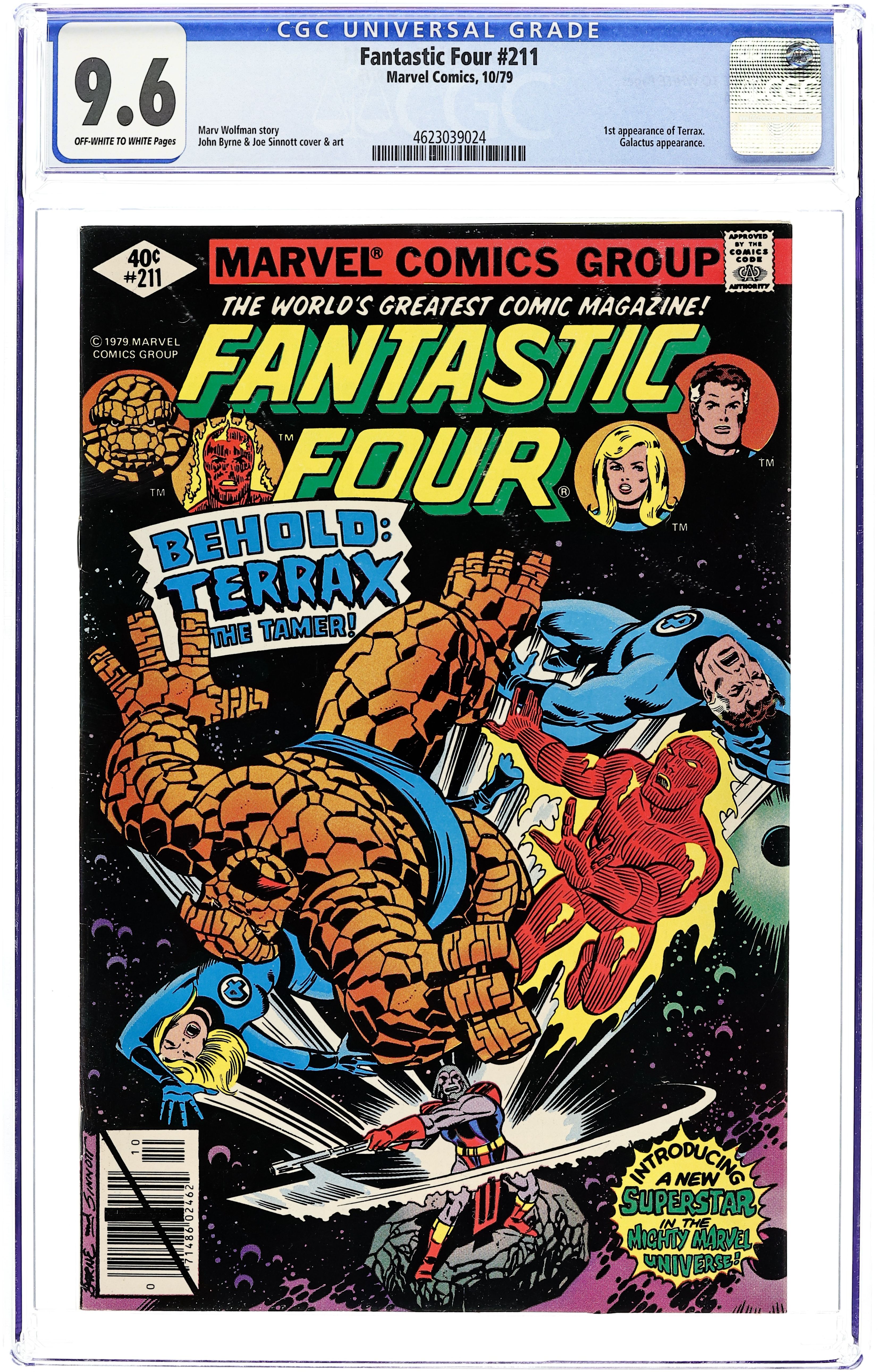 Direct Edition. 1st appearance of Terrax the Tamer - "If This Be Terrax" Written by Marv Wolfman. Pencils by John Byrne. Inks by Joe Sinnott. Cover by John Byrne and Joe Sinnott. Galactus sends the Fantastic Four to an alien plant to capture its tyrannical ruler named Tyros! Can the three aging members of the FF plus the Human Torch muster the strength to defeat Tyros? Cameo appearance by the Watcher and flashback appearances by the Silver Surfer, Air Walker, and Firelord. Note: First appearance of Terrax the Tamer. 36 pgs. Cover price $0.40. Grade: CGC 9.6 explanation of grade Condition: Used (collectible)