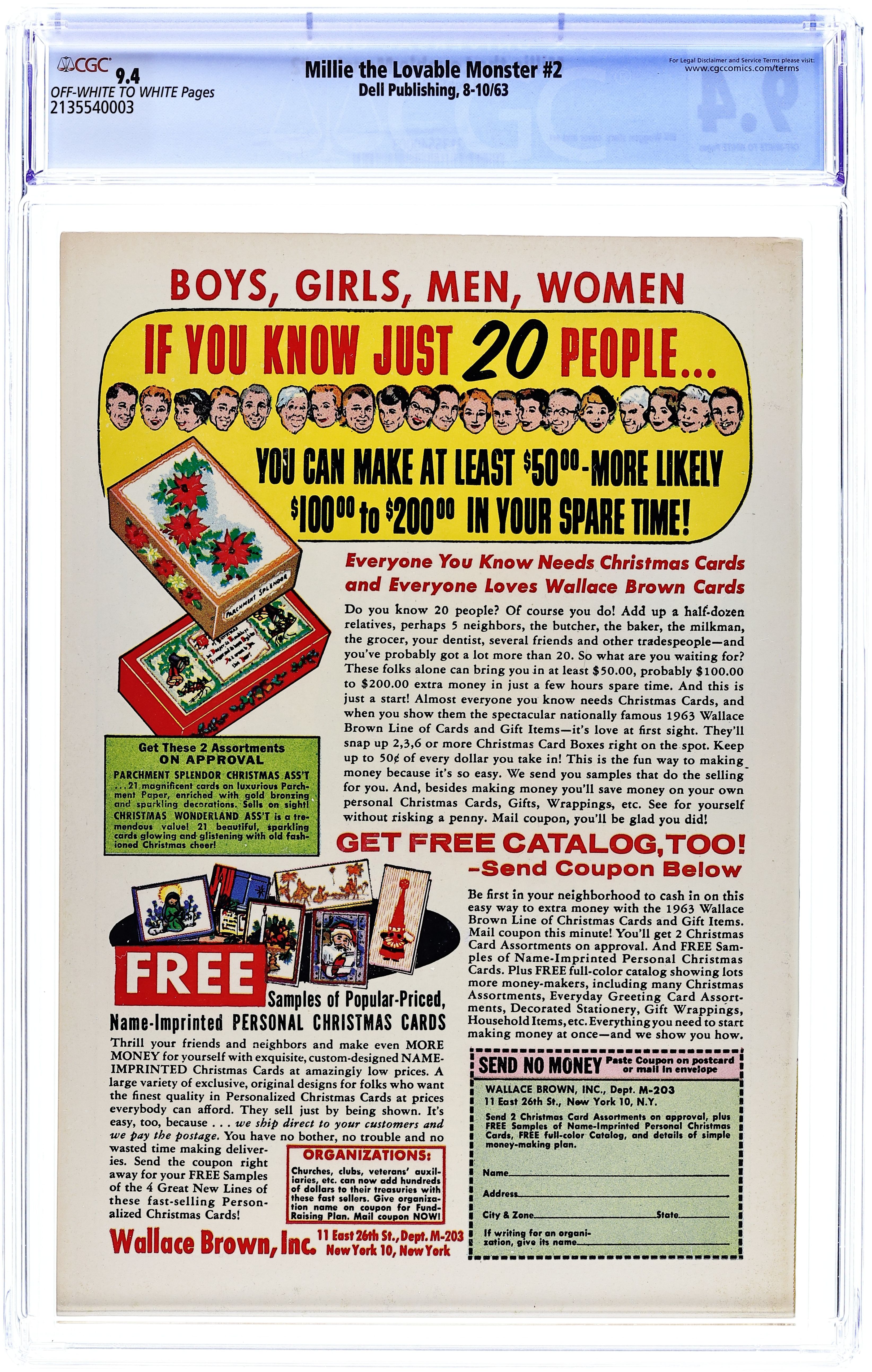 Cover art by Bill Woggon. "What Millie Wants......Millie Gets," script and art by Bill Woggon; Millie throws a house-warming party and invites her Hollywood monster friends. "Millie Buys a House Pet," script and art by Bill Woggon; Millie gets a pet cat. "The Ghosts Return to Haunt Millie," script and art by Bill Woggon; Mr. Gotrocks is upset at how much money Millie is costing him and now wants her out of town. 36 pages, full color. Cover price $0.12. Grade: CGC 9.4 explanation of grade Condition: Used (collectible)
