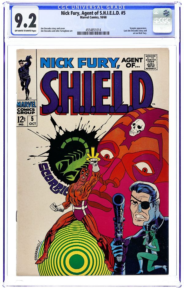 Cover by Jim Steranko. "What Ever Happened To Scorpio?", script by Jim Steranko, pencils by Jim Steranko, inks by John Tartaglione; Val reads Nick's horoscope in the morning paper, which says "Someone in your past will return today"; Nick pays a visit on Pickman, who's helping him locate someone, and he doesn't want SHIELD involved; The ESP Division picks up "possible danger", sending Nick to a seemingly-deserted warehouse - and straight into a trap set by Scorpio!; Nick's Farrari is destroyed, and Nick is captured; While unconscious, Scorpio creates a face-mask to allow him to impersonate Nick, then goes in disguise to view the test of the latest model of LMD; But as it begins, no one else realizes the robot has been replaced with Nick, drugged so he can't speak!; Miraculously, Fury manages to dodge one death trap after another, then faces his would-be killer; Val, trying to save Nick's life, shoots at the "LMD" - but hits Pickman instead, who found his way in via a secret passage. Letters to the editor from comics writer Don McGregor and fanzine publisher Ronn Foss. 36 pgs., full color. $0.12. Cover price $0.12. Grade: CGC 9.2 explanation of grade Condition: Used (collectible)