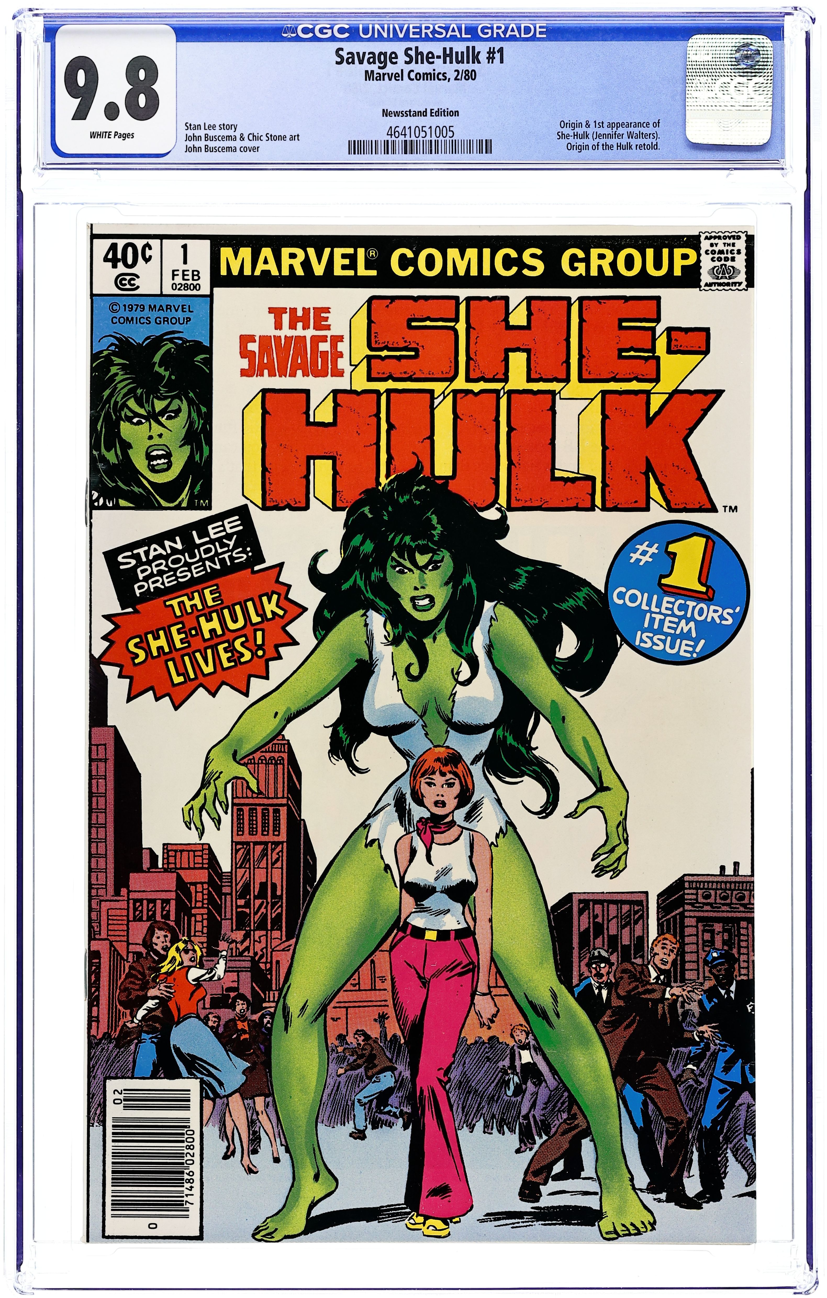 Newsstand Edition. 1st appearance and origin of the She Hulk. "The She-Hulk Lives!" Guest-starring Bruce Banner. Story by Stan Lee. Art by John Buscema and Chic Stone. Jennifer Walters is on the verge of death after an attempted assassination, and the only thing that will save her life is a blood transfusion from her cousin, Bruce Banner...AKA the Incredible Hulk! His gamma-irradiated blood sparks a startling transformation in his cousin, and she will forevermore be known as the Savage She-Hulk! Cover price $0.40. Grade: CGC 9.8 explanation of grade Condition: Used (collectible)