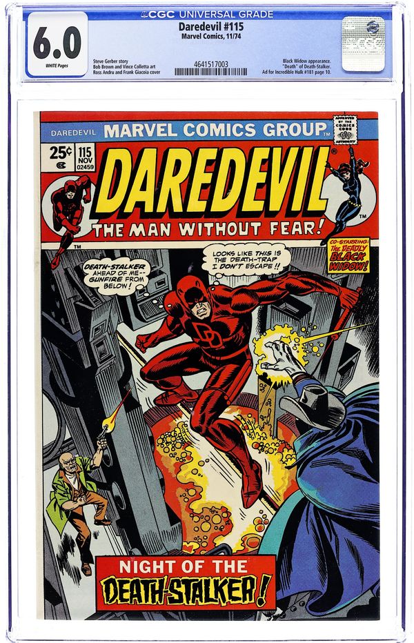 Cover pencils by Ross Andru, inks by Frank Giacoia. Death Stalks the City!, script by Steve Gerber, pencils by Bob Brown, inks by Vince Colletta; DD rescues Candice and Foggy from Death-Stalker but the villain escapes; DD combs the local chemical plants searching for Death-Stalker and, once he discovers him, ends up knocking him into a vat of hydrochloric acid; Black Widow guest appearance; cameos by the Gladiator and Man-Thing. The letters page contains Marvel Value Stamp series A #35 (Killraven by Herb Trimpe), and also an ad for Wolverine's debut in Incredible Hulk #181. 36 pgs. Cover price $0.25. Cover price $0.25. Grade: CGC 6.0 explanation of grade Condition: Used (collectible)