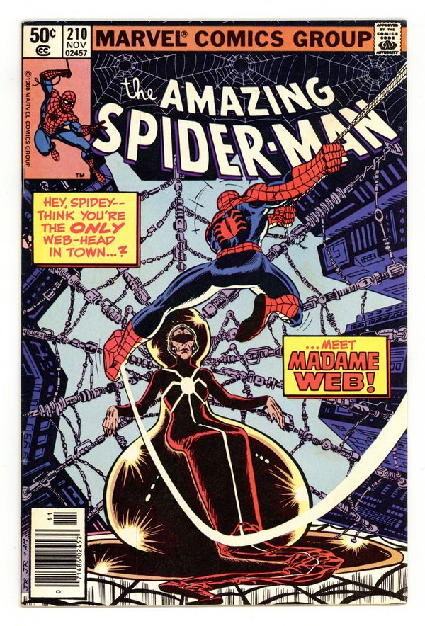 Starts Dec 22 Newsstand Edition. "The Prophecy of Madame Web!" First appearance of Madame Web. Script by Denny O'Neil. Art by John Romita Jr. (breakdowns) and Joe Sinnott (finishes). Cover by John Romita Jr. and Al Milgrom. Masked gunmen barge into the board room of the Daily Globe and kidnap its publisher K.J. Clayton! Fortunately though, the web-slinger is nearby and gives chase! The wall-crawler doesn't catch the criminals, but he does catch a clue! A mysterious clairvoyant called Madame Web is somehow connected to the victim! After befriending the aging soothsayer and heeding her advice, Spider-Man rushes off to the rescue! Can the web-slinger find the missing publisher and get the Daily Globe back in circulation? Cameo appearance by J. Jonah Jameson. (Notes: Peter Parker ends his employment with the Daily Globe. Madame Web appears next in Amazing Spider-Man 216. John Romita Jr. begins his three-and-a-half year run as the penciler of the Amazing Spider-Man title.) 36 pages, full color. Cover price $0.50. Grade: FN 6.0 explanation of grade Condition: Used (collectible)