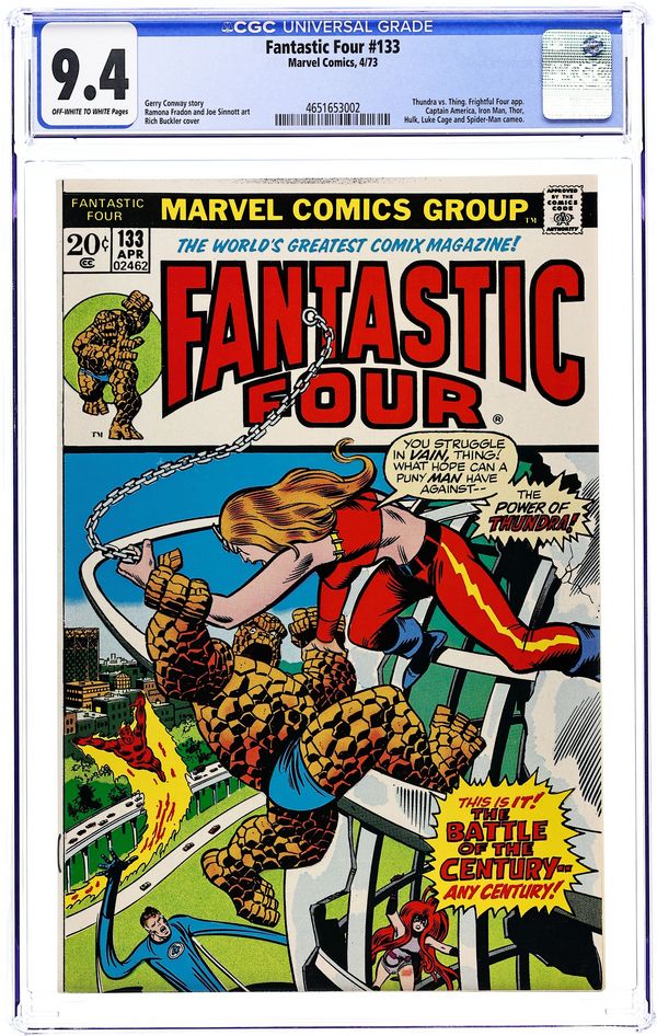 "Thundra at Dawn!" Guest-starring Thundra. Plot by Roy Thomas. Script by Gerry Conway. Pencils by Ramona Fradon. Inks by Joe Sinnott. Cover by John Buscema and Joe Sinnott. It's New Year's Eve in Times Square! Everyone is in a celebratory mood, except the Fantastic Four. Affairs of the heart are plaguing both Reed and Johnny, while Ben and his girlfriend Alicia are doing great! However, the Thing's fortunes change in a New York minute, when Thundra dramatically reappears at the stroke of midnight, challenges Ben to a fight, and kidnaps Alicia! What a set of revoltin' developments! The colossal confrontation between the two mighty warriors begins at Shea Stadium and ends at the Unisphere (from the 1964 World's Fair)! Can the blue-eyed idol of millions find the inner strength to bring down (the) Thundra? Cameo appearances by Captain America, the Hulk, Iron Man, Power Man, Spider-Man, Thor, Sandman, Trapster, and Wizard. (Notes: This is one of the very few issues that Ramona Fradon drew for Marvel. Gerry Conway begins his 20-issue scripting run on the Fantastic Four series. Thundra appears next in Giant-Size Super-Stars 1.) 36 pages Cover price $0.20. Grade: CGC 9.4 explanation of grade Condition: Used (collectible)