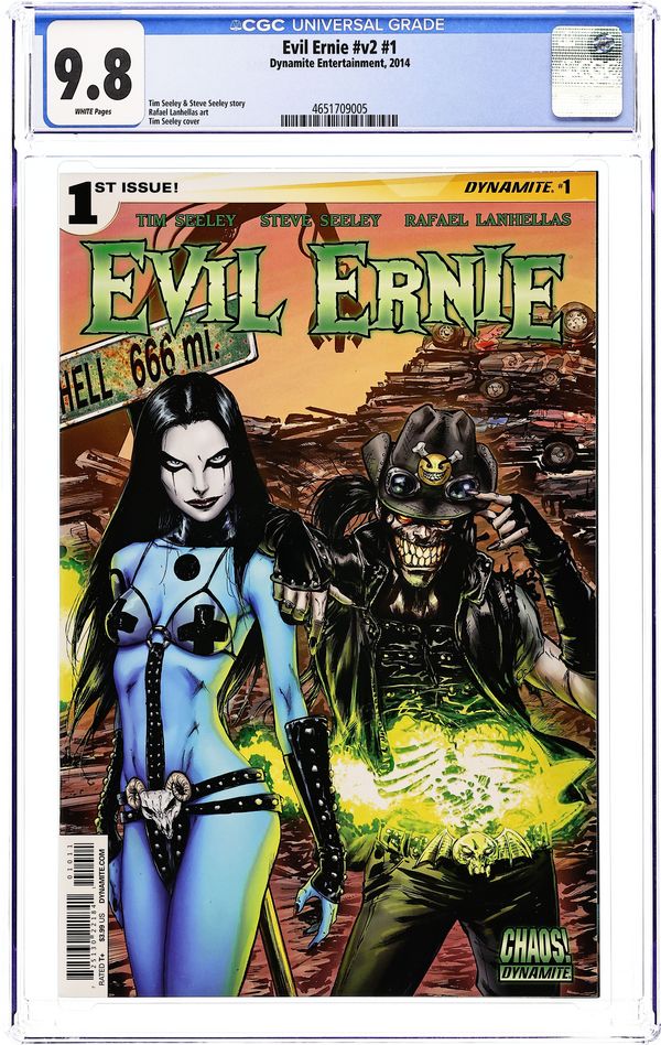 Starts Dec 22 Written by Tim Seeley and Steve Seeley. Art by Rafael Lanhellas. Cover by Tim Seeley. Teen psychopath Evil Ernie is dead, resigned to Hell where he belongs. But when reality is threatened by an evil even the Devil can't handle, he calls on the only weapon that can prevent total megadeath: Evil Ernie himself! Mistress Hel has found new love... three of them! And the antihero to end all antiheroes is the world of Chaos' only hope. 32 pages, full color. Rated T+ Cover price $3.99. Grade: CGC 9.8 explanation of grade Condition: Used (collectible)