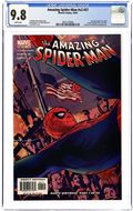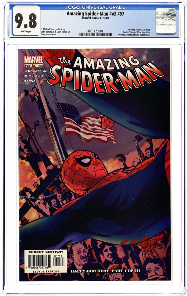 Starts Dec 22 Written by J. MICHAEL STRACZYNSKI Pencils by JOHN ROMITA JR. Cover by TONY HARRIS J. Michael Straczynski is back flying the Spider-Man ship solo in a 2-part story arc leading up to October's AMAZING SPIDER-MAN #500! Entitled "HAPPY BIRTHDAY," the story kicks off with a major inter-dimensional threat unveiled on midtown Manhattan, spurring Spider-Man into battle alongside a who's who roster of guest-stars, including the FF, Thor, Iron Man, Cyclops, and Dr. Strange. This is JMS and JR throwing down with some major widescreen action, and it leads to the monumental #500, featuring a moment that will catch comicdom completely by surprise. 36 PGS./MARVEL PG...$2.25 UPC: 5960604716-05711 Cover price $2.25. Grade: CGC 9.8 explanation of grade Condition: Used (collectible)