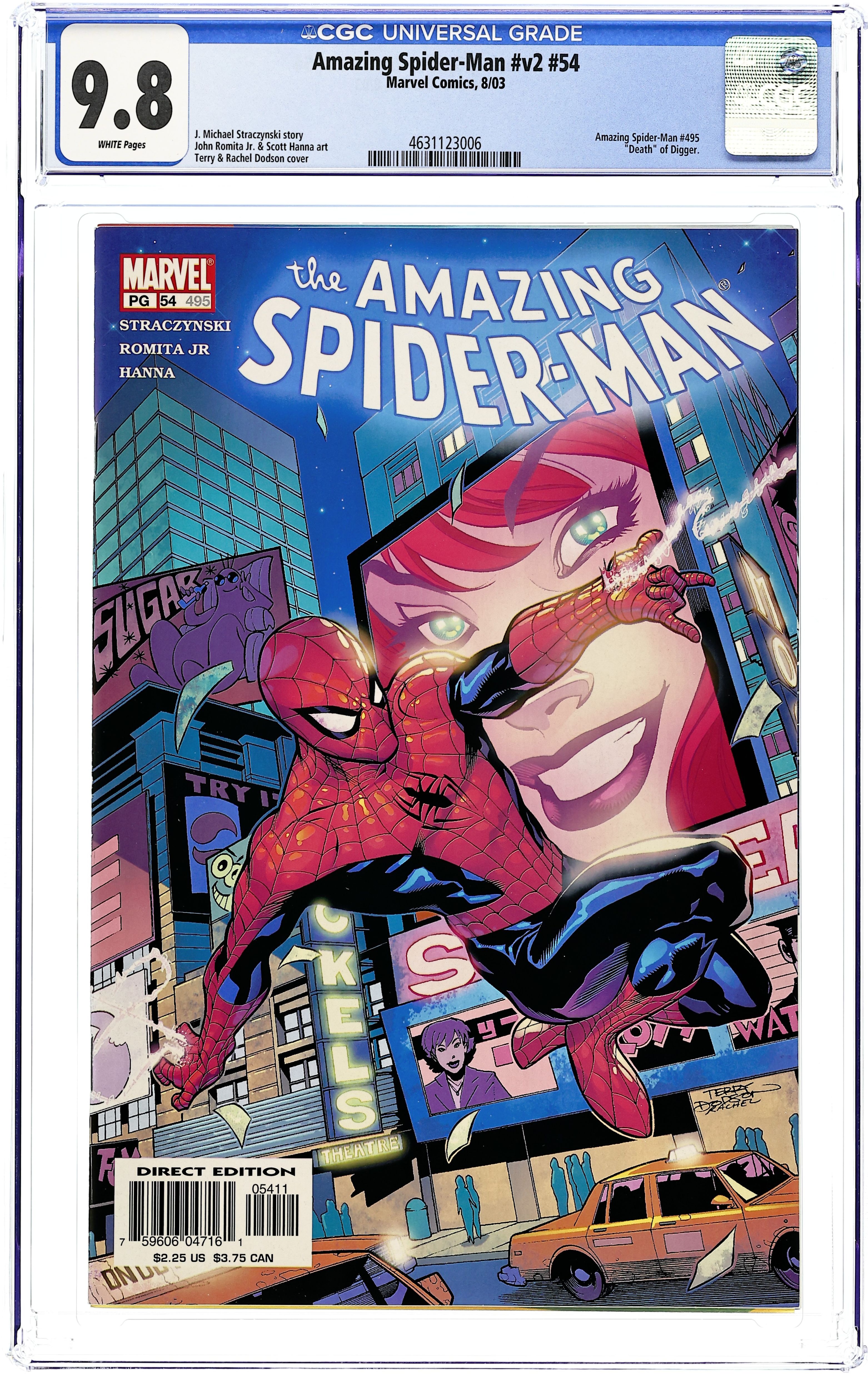 Starts Dec 22 Cover by Terry Dodson. "The Balancing of Karmic Accounts," script by J. Michael Straczynski, pencils by John Romita, Jr., inks by Scott Hanna; Armed with a way to take Digger down, Spider-Man and Lieutenant William Lamont put his idea to the test; Spidey attacks Digger, chasing him into the sewer; Also, Spidey has a little surprise for his new boss, Morris Forelli. 44 pgs., $2.25. Cover price $2.25. Grade: CGC 9.8 explanation of grade Condition: Used (collectible)