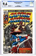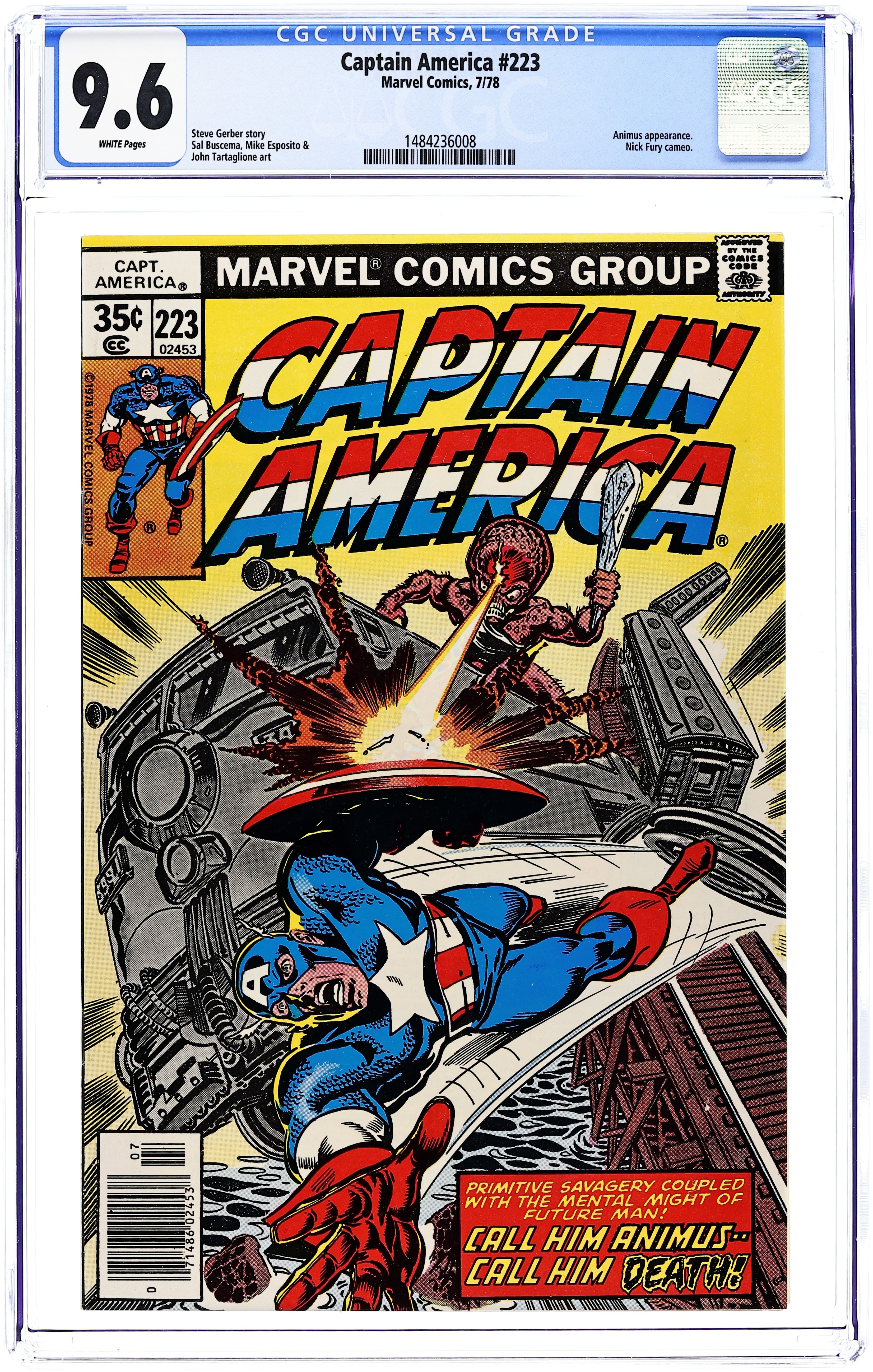 "Call Me Animus" Part 2 of 2. Script by Steve Gerber. Art by Sal Buscema (breakdowns), Mike Esposito (finishes), and John Tartaglione (finishes). Cover by John Byrne and Ricardo Villamonte. In the District of Columbia at the Lincoln Memorial, Animus strikes! And quickly the Sentinel of Liberty is on the defensive vs. this crazy creature! The Animus seems to be a powerful combination of prehistoric man and future man. However, the strange villain vanishes just as Cap is about to win their first fight! The next day as Steve Rogers returns to New York, his passenger train is attacked by Animus! And round two between Captain America and the Animus begins! Cameo appearances by Nick Fury, Veda, and Senator Kligger Stivak. (Notes: Starting with this issue, the Falcon is removed from the cover logo. The title reads "Captain America" only.) 36 pages. Cover price $0.35. Grade: CGC 9.6 explanation of grade Condition: Used (collectible)