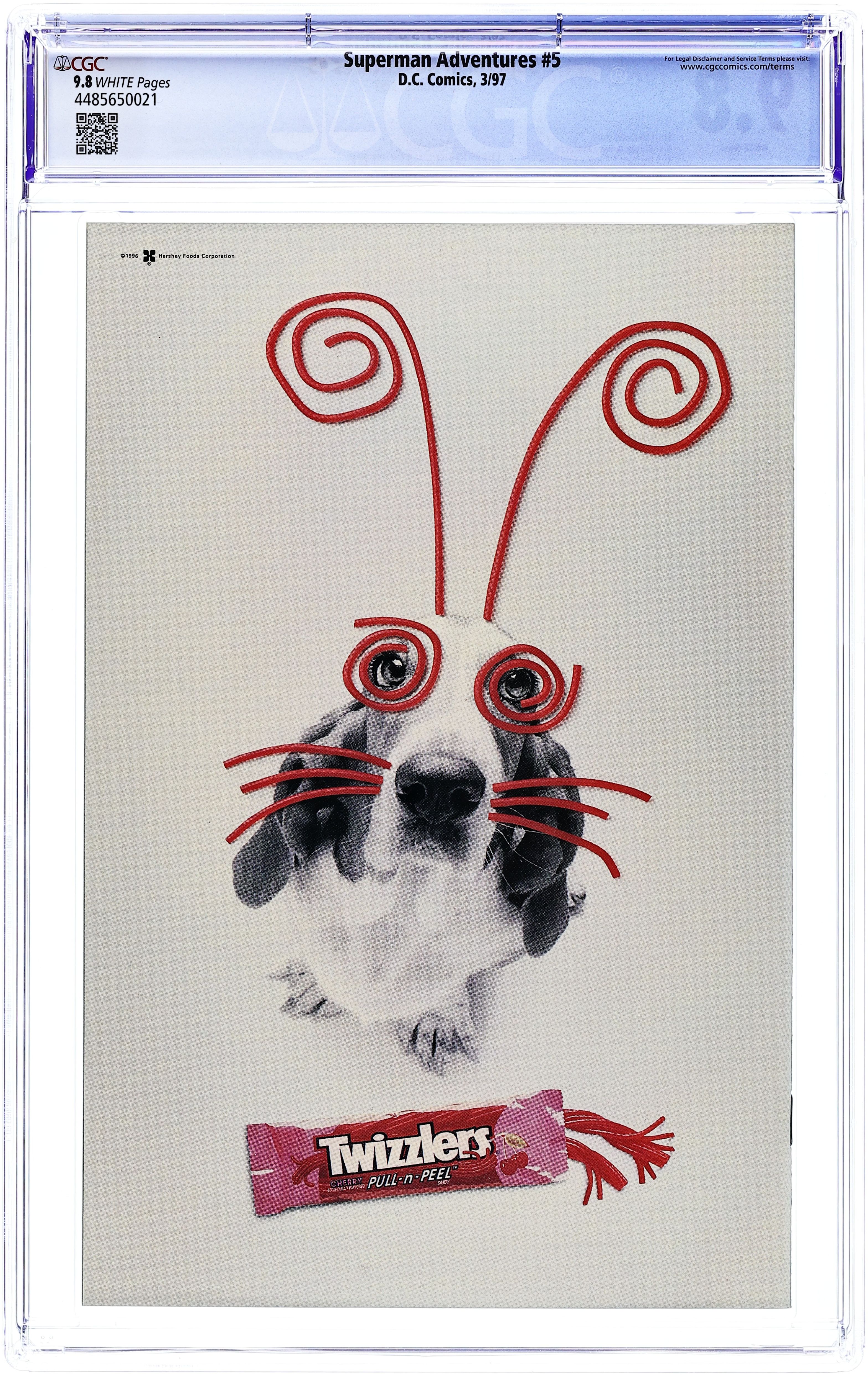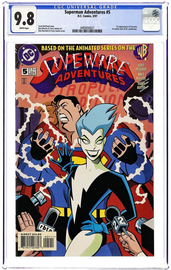 Cover pencils by Rick Burchett, inks by Terry Austin. Balance of Power, script by Scott McCloud, pencils by Bret Blevins, inks by Terry Austin; Live Wire (1st appearance) revives and decides to make up for years of male domination of women by preventing the work of any men from appearing in any mass communications medium; After an initial defeat at the hands of Live Wire, Superman challenges her to another match, where, with the help of Luthor's technology, the Man of Steel contains the villainess. Based on the WB cartoon series. 36 pgs. $1.75. Cover price $1.75. Grade: CGC 9.8 explanation of grade Condition: Used (collectible)