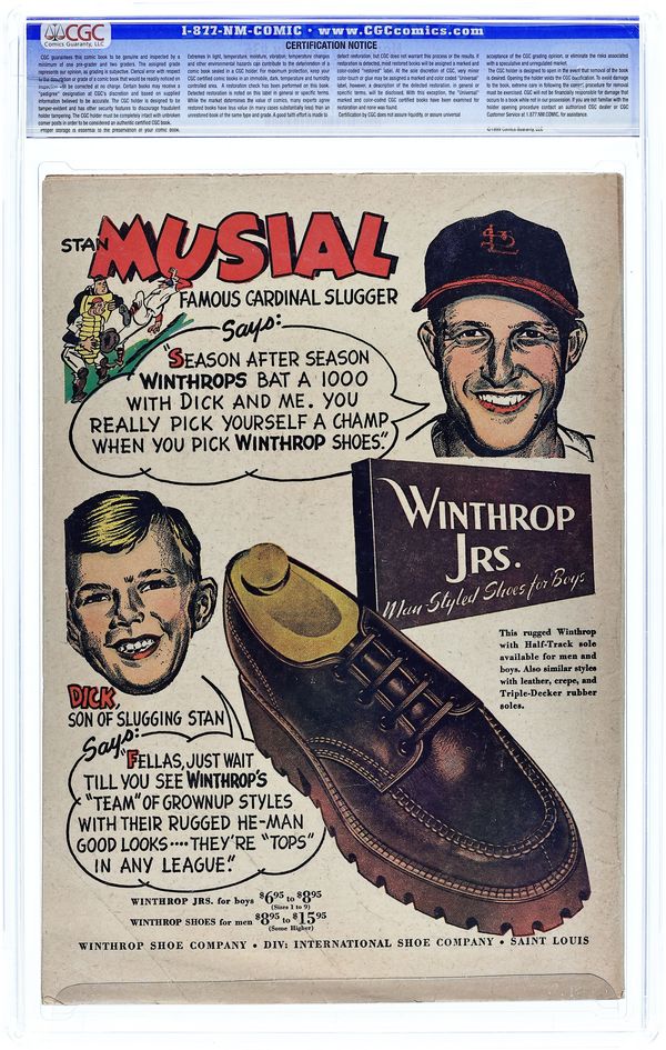Starts Dec 22 Stories and art by Frank Bolle and Joe Millard, plus "Comix Cards" by Mac Raboy. Western adventure featuring one of the most popular heroes of the mid-20th century, star of TV, film and radio. Hopalong leads a posse to capture the mysterious outlaw known as the White Rider, in an issue-length adventure. But the Rider has a mountain hideout, and a hostage to boot. Pistol Packin' Pattie explains to a bully what she means when she says "you're going to find your amazing personality in jail." And a vintage Carnation Milk ad, Rocky Lane Ropes a Killer, featuring movie cowboy Rocky Lane. Plus Comix Cards (like the later Marvel Value Stamps) featuring Captain Marvel Jr. art by Mac Raboy. The White Rider!; Brand of Justice; Pistol Packin' Pattie; Whitey Whiskers: Close Shave; Windy. 32 pages, Full Color. Cover price $0.10. Grade: CGC 6.5 explanation of grade Condition: Used (collectible)