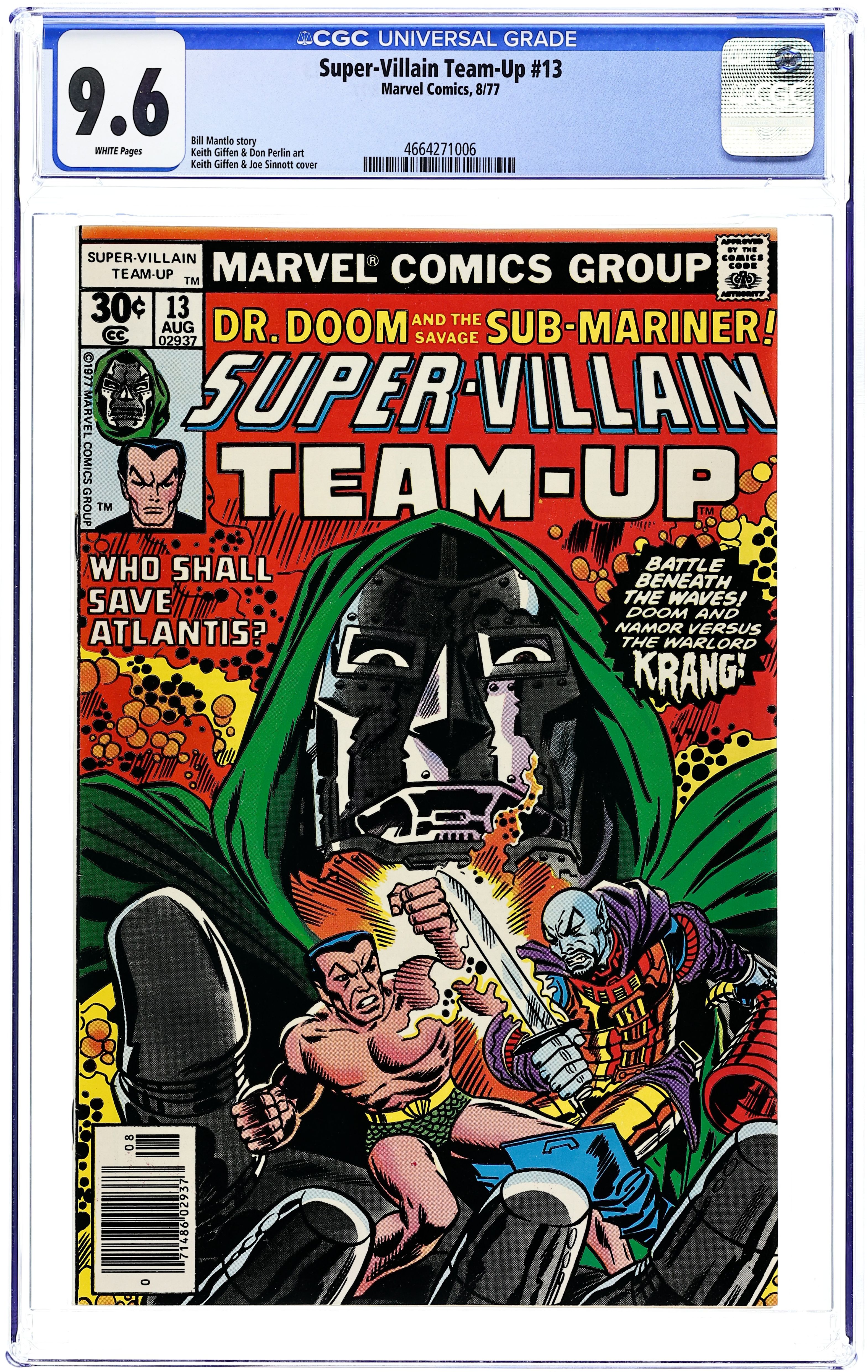 "When Walks The Warlord!" Story by Bill Mantlo and Keith Giffen. Art by Keith Giffen and Don Perlin. In an effort to fulfill his oath to the Sub-Mariner, Doctor Doom journeys beneath the ocean to revive the comatose citizens of Atlantis. However, before the Latverian monarch can save the people of Atlantis, Namor must defeat the interfering Warlord Krang! 32 pages Cover price $0.30. Grade: CGC 9.6 explanation of grade Condition: Used (collectible)